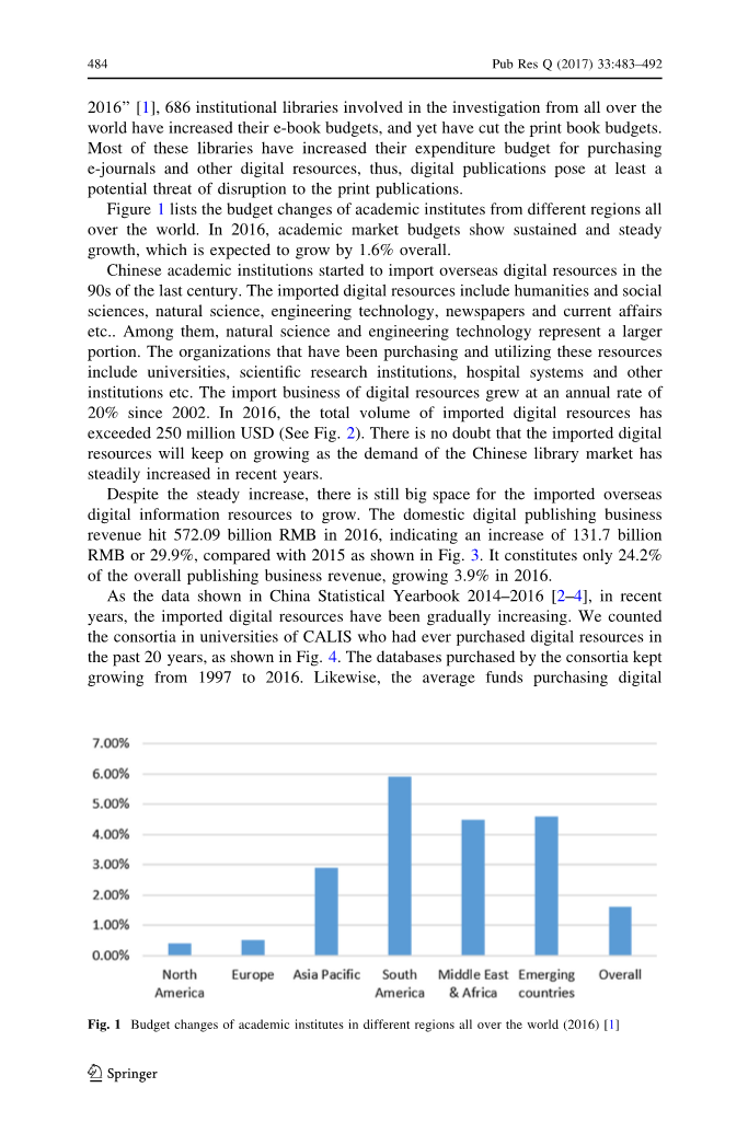 我们从专注于数字或电子书内容的学术市场预算的全球增长趋势开始,因为它是数字出版市场的重要指标。根据PCG报告“图书馆预算预测”2016年,参与调查的686家机构图书馆增加了他们的电子书预算,但却削减了印刷图书的预算。大多数这些图书馆增加了购买电子期刊和其他数字资源的支出预算,因此,数字出版物至少构成了对印刷出版物造成破坏的潜在威胁。