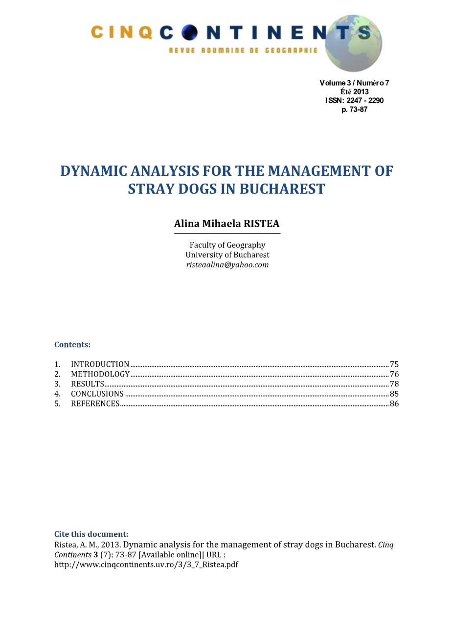 纵观历史,景观概念一直存在争议。城市景观由特征,模型和城市结构定义。因此,每个城市景观都具有与其他同类型相似的元素,但是具有独特性和多样性的相关性。布加勒斯特是由关键结构定义的,如建筑物(Casa Poporului,国家图书馆),历史古迹(凯旋门),公园(Herăstrău)等等。但是在社会层面和感知上,流浪狗扰乱了景观,他们将人们分为两个营地,爱人和仇敌。大型城市生态系统由于其中发生激烈的人类活动而处于高度污染状态,导致环境干扰的产生[1]。但是,关于布加勒斯特的景观,我们可以谈论因流浪狗而造成的环境干扰。术语“流浪狗”是指普通品种的狗[2],它在前苏联和巴尔干半岛成为一个持续而令人担忧的存在,而且在亚洲和南美洲也是如此。人类对动物的态度是动物福利领域的核心问题[3]。态度领域是一本开放的书,对个人而言具有不同的相关性。但总的来说,我们都知道,对动物的消极态度与他们反过来的行为有关,人们观点的积极变化可以改善动物相关立法和公共政策[4,5]。根据Serpell的两个动机考虑,影响和效用,了解这种态度和价值的起源非常重要,可以这样描述。这个问题有许多研究,最着名的是在美国开展的一项调查,其目的是提取九种不同的态度分量表[6,7,8]。与身体,认知和行为方式更接近人类并与它们更相似的动物似乎比那些远离或不相似的动物产生更积极的影响[9,10,11,12]。因此,首都和国内日益引起争议的问题是流浪狗越来越多的滋生导致社会和政治问题。对于他们的绝育或庇护,需要提出投诉以向当局显示实地情况(地点,行为,人数等)。这项研究的目标包括确定狗的城市景观受到影响的位置,根据投诉,建立由他们造成的最大问题和最大“人群”的地区,观察对人口的正面和负面影响,街上有免费四足动物的环境。地图将使用GIS技术完成。基本上,公民对A.S.P.A收到的对流浪狗的抱怨。 (动物保护和监督管理局)在布加勒斯特,是Cinq大陆第3卷,Numeacute;ro7,2013,p。 73-87 [76]标准化为一种常见形式,并在该地区的地图上作为准时形式引入。此外,数据库的创建信息尽可能多,在处理完成后,我们将获得分析和专题图。我认为这是一个关于当前问题的重要主题,将在近期解决。通过这项研究,我希望能够以这种或那种方式为四足动物的情况做出新的决定,并强调人口在解决这个问题的愿望中的公民意涵。分析的时期是2011年。