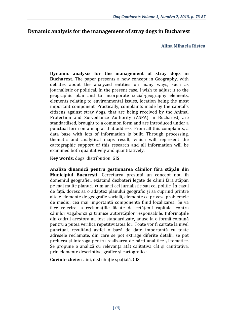 摘要:流浪狗管理的动态分析布加勒斯特。本文提出了一种新的地理概念。关于被分析实的许多方面的争论,例如新闻的或政治的在目前的情况下,我希望把它调整到地理规划和融入社会地理要素,与环境问题有关的元素,位置最重要组成部分。实际上,首都的投诉市民对流浪狗,动物正在接受保护和监督机构(布加勒斯特)标准化,带来了一种共同的形式,并被引入准时在地图上的那个地址。从所有这些抱怨中,建立了具有大量信息的数据库。通过加工,主题和分析地图结果,将代表这项研究的地图支持和所有信息将是定性和定量检验。