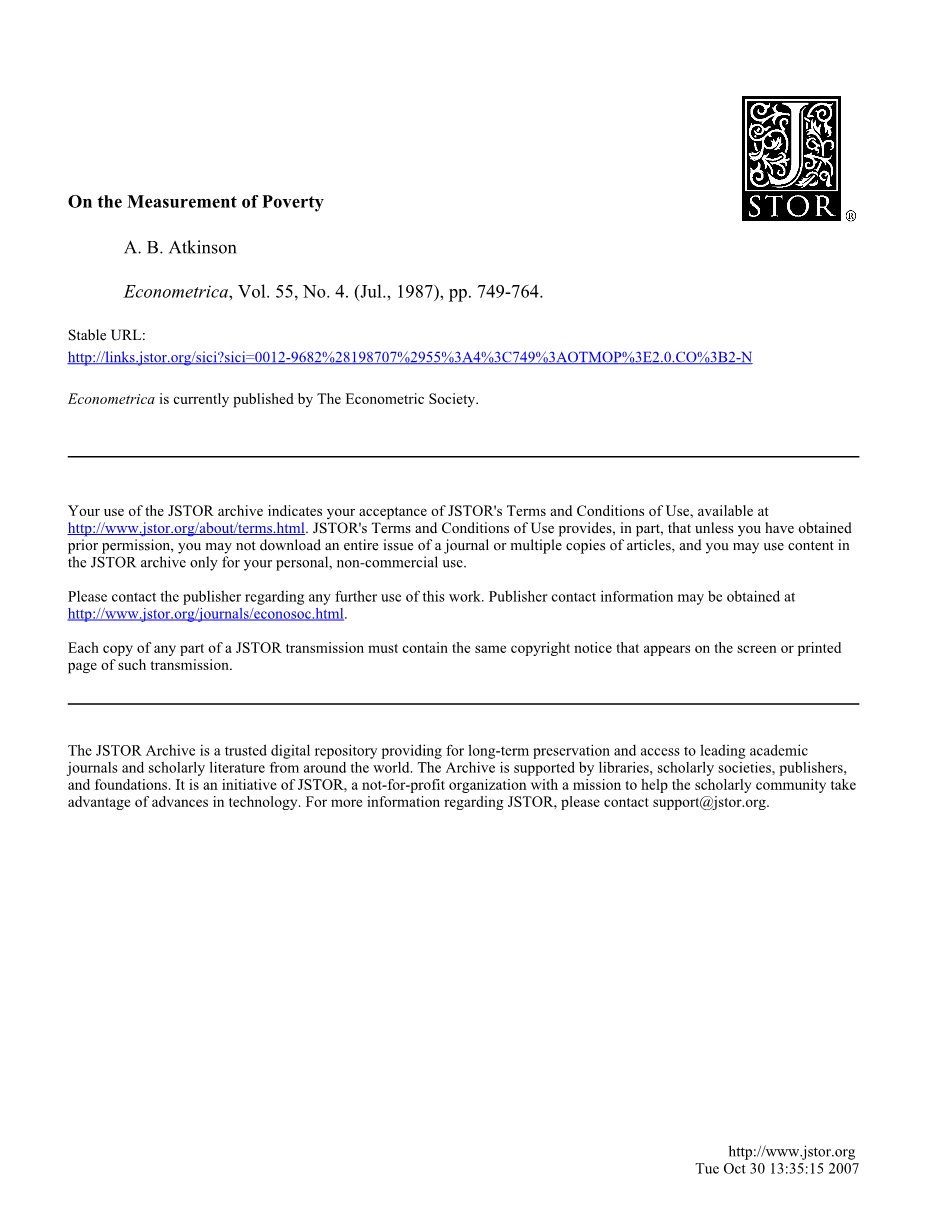 开始时使用的头部计数测量(H)受到严重攻击。大约20年前,Watts注意到它“几乎没有什么可推荐的”(1968年,第326页)。在他颇具影响力的著作中,Sen曾指出,这一措施所获得的支持程度“相当惊人”(1979年,第295页),并批评Bowley以H. Watts、Sen和其他许多作者的身份认同衡量贫困的标准,因此提出了替代方案(参见Foster, 1984,为一项有价值的调查),为怀疑论者打开了门,声称这可能导致相互矛盾的结论。
