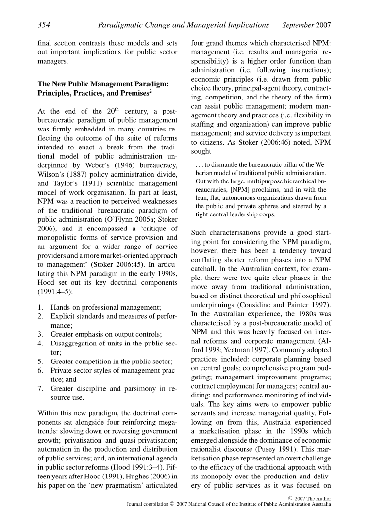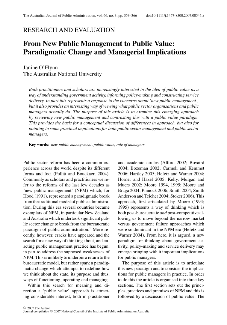 NPM范式包含了以个人主义、工具性和个人理性为中心的关于人类行为的具体假设,由此产生了新的绩效激励型管理、机构安排、新的结构形式和新的管理理论。从这些角度出发,我们提出了一套核心原则,即持续的净现值:(i)经济市场应是公共部门关系的模型;(i i)政策、实施和交付职能应作为一系列合同分开并构建;(i i i)应引进一系列新的管理技术。包括基于绩效的控制、竞争、市场激励和放松管制。在新产品管理范式中,政府的观察、构建和安排方式牢牢地植根于经济框架,从这里开始,政策修辞集中于小政府优越的概念,以及为了最大限度地提高效率,必须解决政府的失败问题。这往往导致处方围绕竞争和冲突而建立,结果是一个根深蒂固的后官僚模式,不仅在澳大利亚,而且在世界上许多国家。