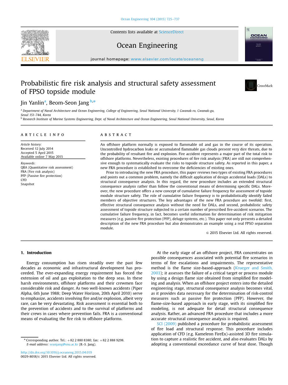 在过去几十年中,伴随着经济和基础设施的发展,能源消费稳步上升。随着能源需求的不断扩大,石油和天然气的开采已经深入到深海。在这些恶劣的环境中,海上平台及其船员面临相当大的风险和危险。两个众所周知的事故(Piper Alpha,1988年6月6日;“深水地平线”,2010年4月20日)足以说明,涉及火灾和/或爆炸事故的事故虽然非常罕见,但是具有非常大毁灭性。风险评估对预防事故和平台及其机组在预防失效的情况下的生存是必不可的。 FRA是常规的评估海上平台火灾风险的方法。在离岸项目的早期阶段,FRA聚焦于与火灾升级和损害方面的潜在火灾情况相关的可能后果。代表性的方法是基于火焰尺寸的方法(Kruegerand Smith,2003);它通过使用从简化的火焰建模和分析获得的设计火焰尺寸来评估关键目标或程序模块的故障。当离岸项目进入详细的工程阶段时,结构后果分析变得至关重要,因为它提供了确定风险控制措施(如被动防火(PFP))所需的数据。然而,基于火焰尺寸的方法在早期阶段采用的简化的火焰模型,不足以进行详细的结构后果分析。相反地,我们需要一种包括更精确的结构后果分析的高级FRA程序。