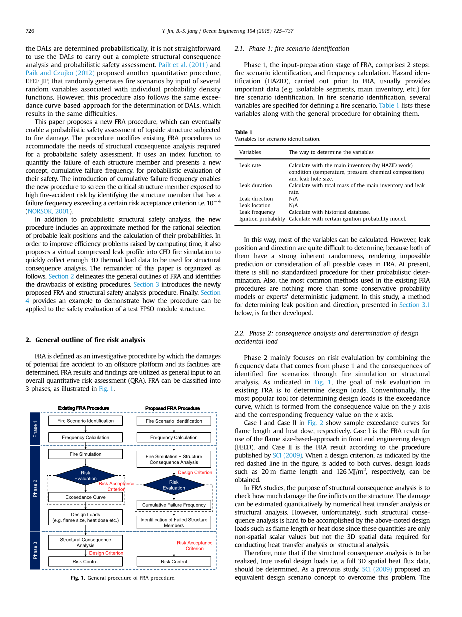 SCI(2009)发布了用于火灾荷载和结构响应的概率评估的程序。该程序包括应用CFD(例如,Kameleon FireEx)辅助的3D火灾模拟来捕获现实的火灾事故,并且还通过采用常规的热量超过曲线来评估DALs。但是DALs是概率性地确定的,不能直接使用DALs进行完整的结构后果分析和概率安全评估。 Paik et al(2011)、Paik和Czujko(2012)提出了另一个定量程序EFEF JIP,通过输入与个体概率密度函数相关的几个随机变量来随机生成火灾情景。然而,该程序也遵循相同的基于超过曲线的方法来测定DAL,这也导致了与上述相同的困境。