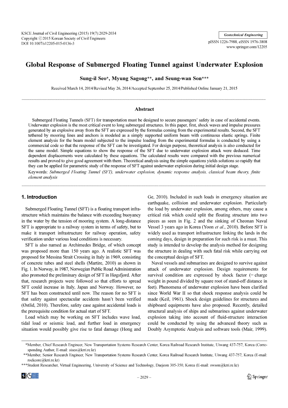 用于运输的水中悬浮隧道(SFT)必须设计成在意外事件的情况下确保乘客的安全。水下爆炸是长期淹没结构的最关键事件。在本文中,首先,由SFT产生的爆炸产生的冲击波和脉冲压力由实验结果的公式表示。其次,由系泊绳和锚固系泊的SFT被建模为具有连续弹性弹簧的简单支撑的均匀梁。对经受来自实验公式的脉冲负载的波束模型的有限元分析通过使用商业码来进行,使得可以研究SFT的响应。为了设计目的,也对同一模型进行理论分析。简单的方程来显示SFT由于水下爆炸攻击的反应。通过这些方程计算时间依赖性位移。计算结果与以前的数值结果进行比较,证明与它们有很好的一致性。使用简单方程的理论分析如此迅速地产生解,使得它们可以应用于在初始设计阶段期间SFT对水下爆炸的响应的参数研究。关键词:水下隧道(SFT),水下爆炸,动态响应分析,古典梁理论,有限元分析