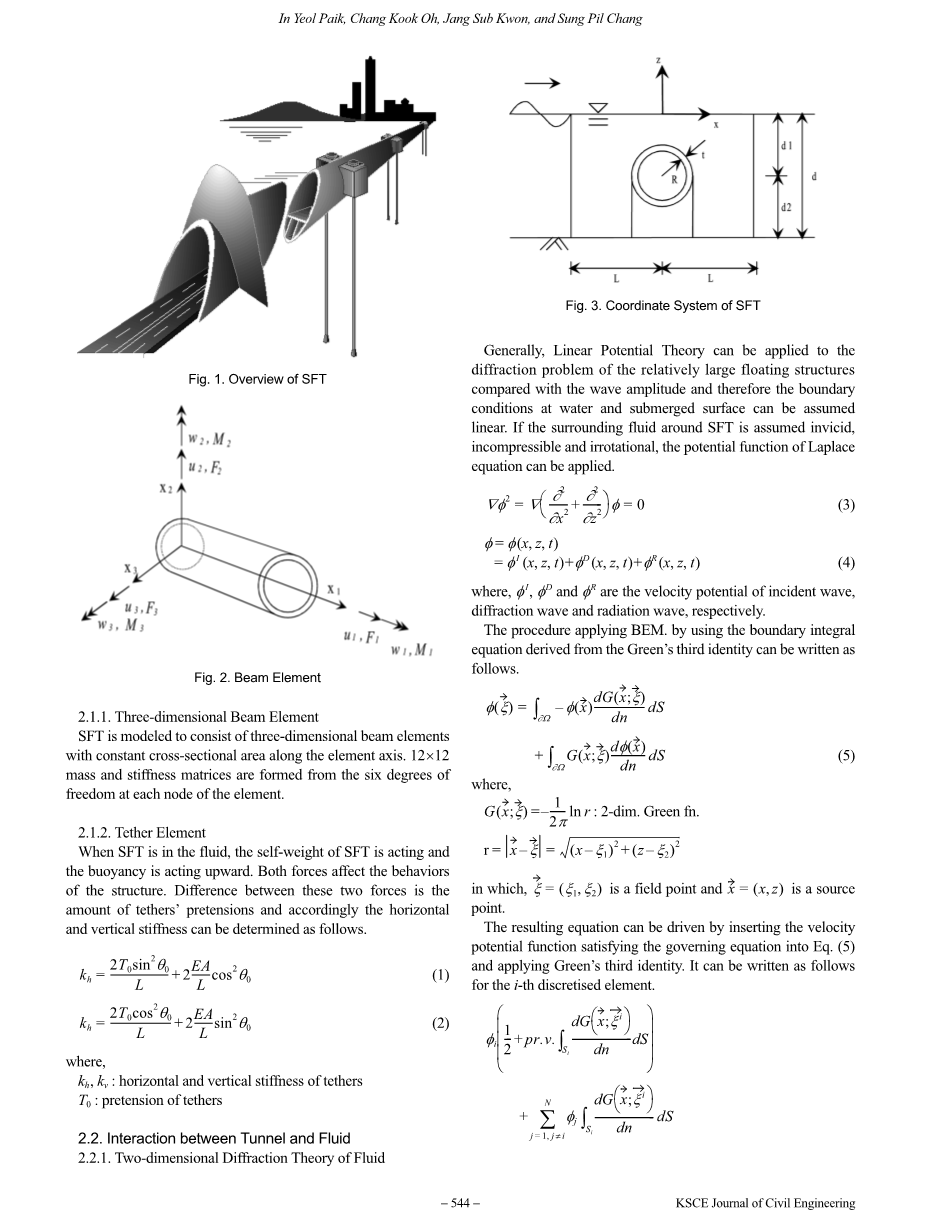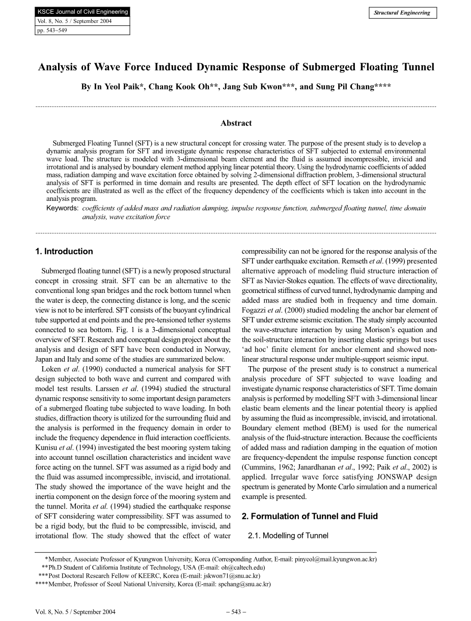水下悬浮隧道(SFT)是一种新的穿越水结构的概念。本研究的目的是开发一个动态分析程序SFT和调查SFT受到外部环境的动态响应特性波负载。假定结构与三维梁单元建模流体不可压缩,无粘性和不可旋,可由边界元法分析出应用线性势理论。使用附加质量的水动力系数,获得的辐射阻尼和波激发力量解决二维衍射问题,三维结构在时域中分析了SFT并给出了结果。SFT位置对水动力系数的影响深度以及频率依赖性的影响系数都被考虑到分析程序中。
