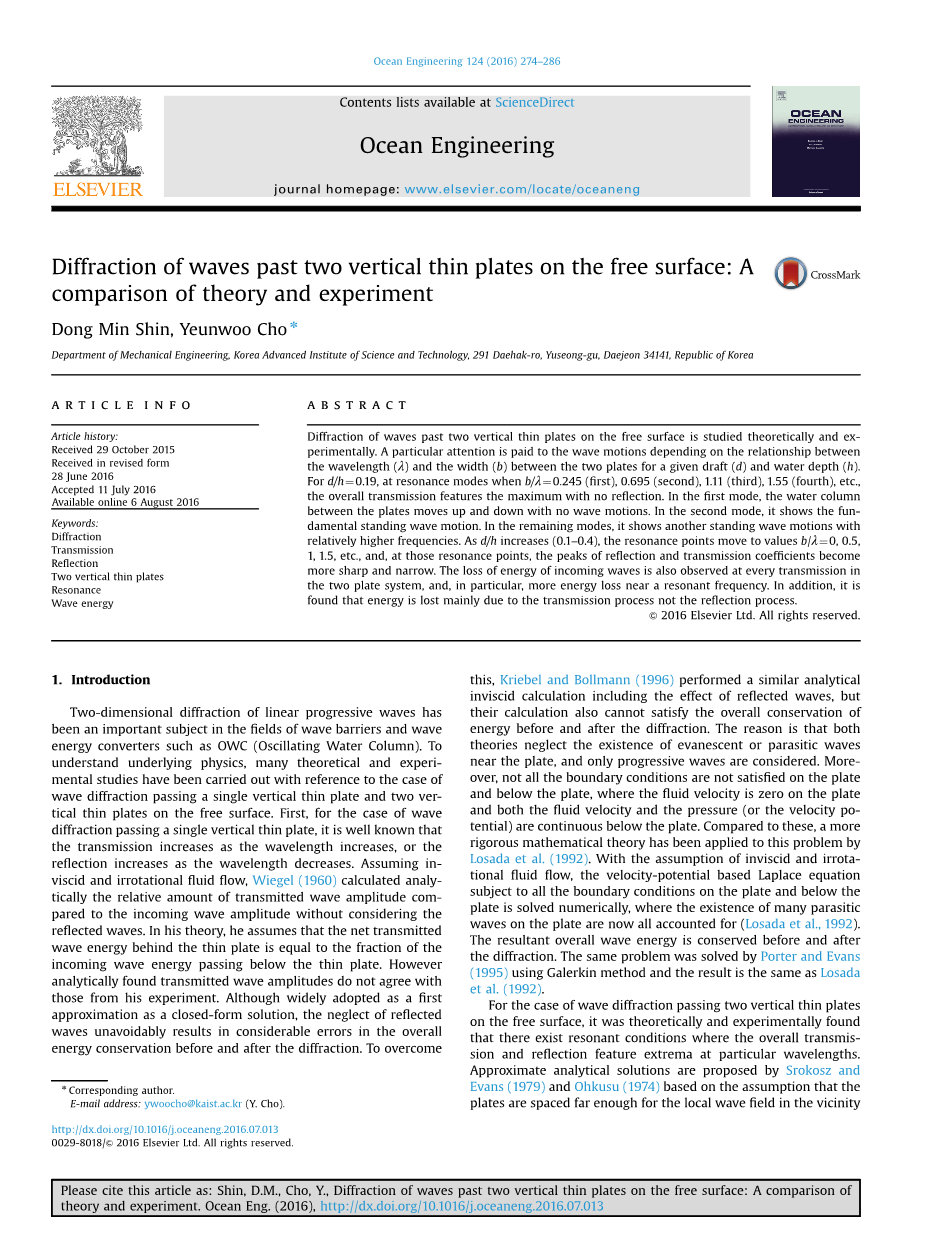 摘要 :从理论和实验上研究了衍射波通过自由表面的两个垂直薄板。特别注意波运动取决于波长之间的关系(lambda;)和两个板块之间的宽度(b)(一个给定的吃水深(d)和水的深度(h))。对于d/h=0.19,在共振模式b /lambda;= 0.245(第一个),0.695(第二),1.11(第三),1.55(第四),等等,整个透射特性的最大无反射。在第一个模式中,水柱在板之间上下运动没有波动。在第二个模式中,在第二个模式中,它显示了基本的驻波运动。在剩下的模式,它显示了另一个驻波运动相对更高的频率。当d / h增加(0.1 - -0.4),谐振点移动到b /lambda;值= 0,0.5、1、1.5,等等,而且,在这些谐振点,反射和透射系数的峰值更加尖锐和狭窄的。在每一个透射两板系统也能观察到入射波能量的损失,特别是,更多的能量损失接近共振频率。另外,我们发现,能量损失主要是由于透射过程而不是反射过程。