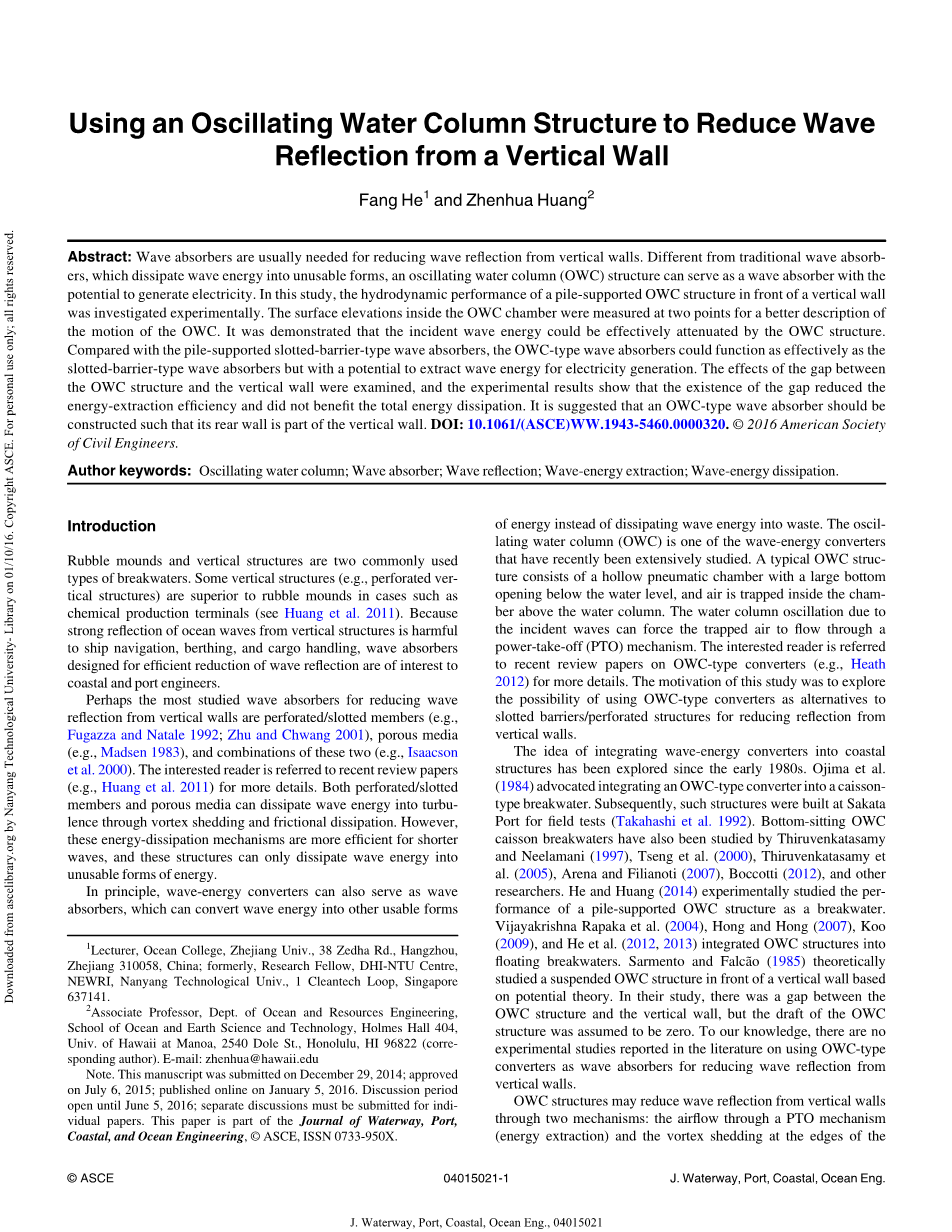 Ojima et al。(1984)提倡将OWC型转换器集成到沉箱型中防波堤。随后,这种结构在Sakata建造现场测试端口(Takahashi等人,1992)。底部OWC沉箱防波堤也被Thiruvenkatasamy研究和Neelamani(1997),Tseng et al。 (2000),Thiruvenkatasamy etet al。 (2005),Arena和Filianoti(2007),Boccotti(2012)等研究人员。他和黄(2014)实验研究了性能的桩支撑OWC结构作为防波堤。Vijayakrishna Rapaka et al。 (2004),Hong和Hong(2007),Koo(2009),和He et al。 (2012年,2013年)将OWC结构纳入浮动防波堤。 Sarmento和Falcatilde;o(1985)理论研究了在垂直墙前面的悬浮OWC结构关于潜在理论。在他们的研究中,之间有一个差距OWC结构和垂直墙,但OWC的草案结构假定为零。据我们所知,没有实验研究报道在使用OWC型的文献中转换器作为减少波对垂直墙壁反射的波吸收器。