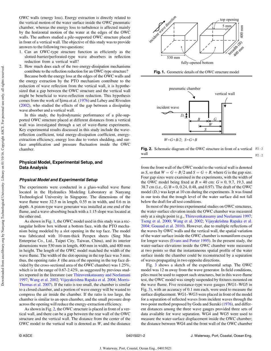 实验在玻璃壁波浪中进行位于南洋的液压模拟实验室新加坡理工大学。 尺寸波浪长32.5米,宽0.55米,0.6米深度。 活塞式波发生器安装在其一端水槽,以及具有1:15斜坡的吸波海滩位于另一端。