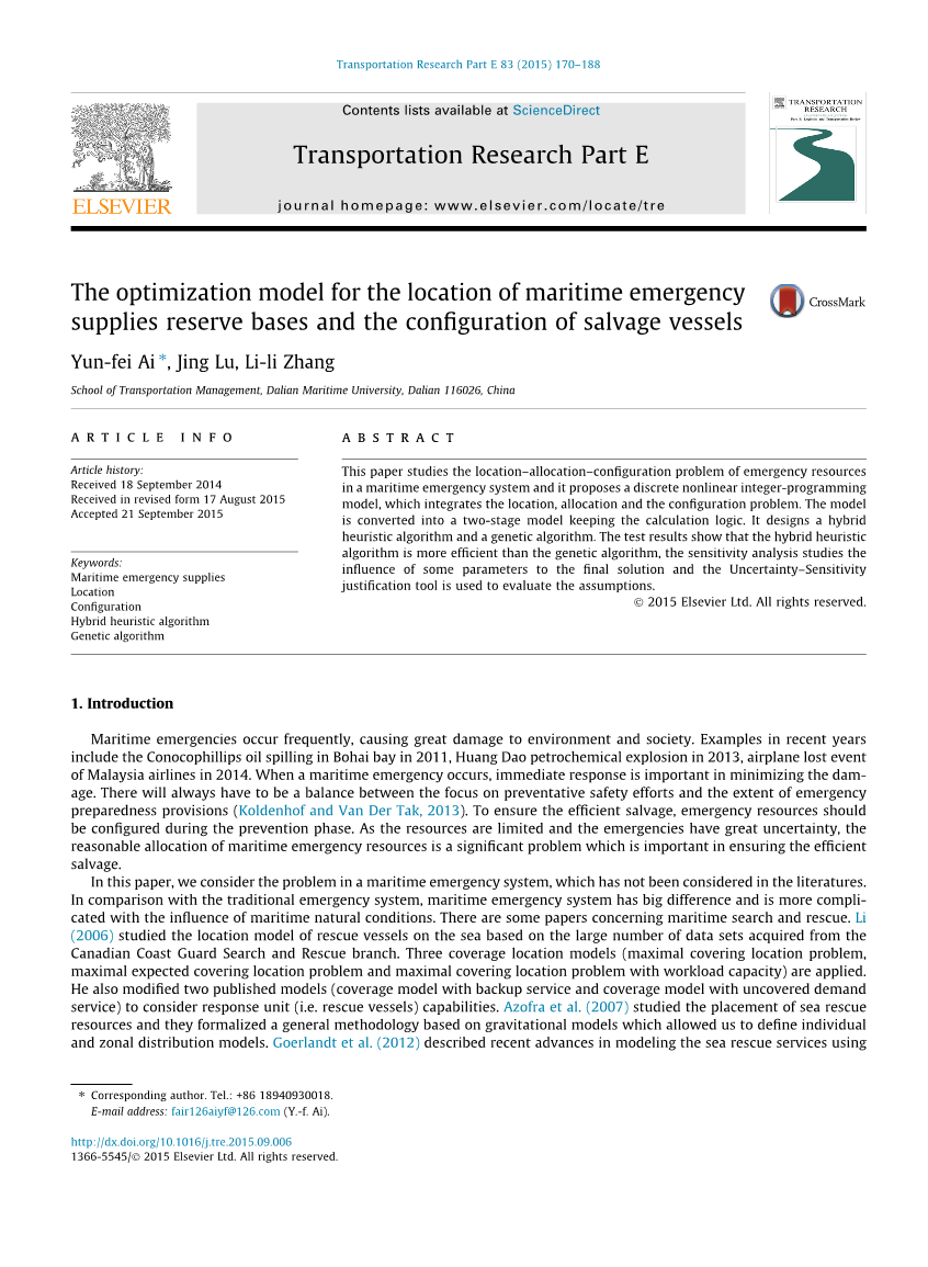 关键词:海事应急救援;选址;配置;混合启发式算法;遗传算法
