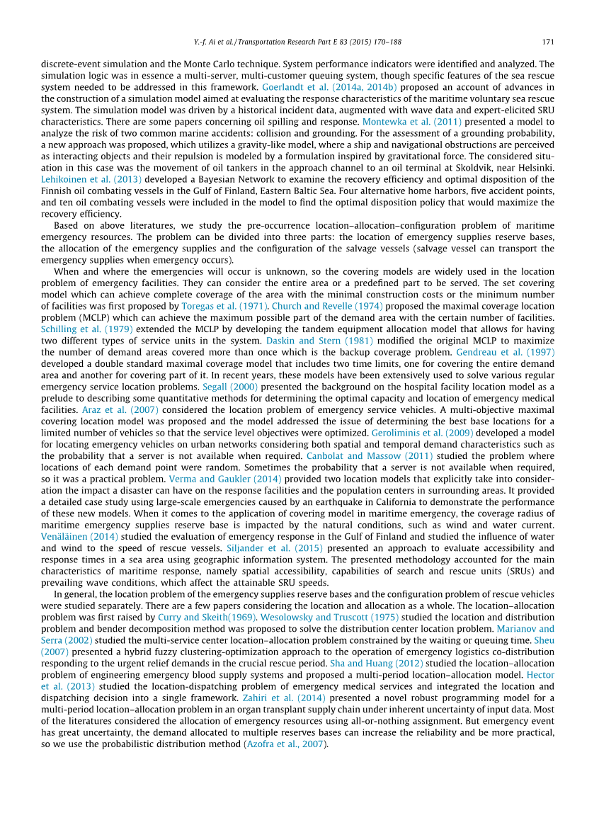 在本文中,我们考虑海事应急系统中的问题,这在文献中尚未被提出。海上应急系统与传统的应急系统有很大的差异,并且受到海洋自然条件的影响而变得更加复杂。以下是对海事搜救进行研究的文献。李(2006)基于加拿大海岸警卫队搜救部门提供的大量数据,研究了海上救援船的位置模型。应用了最大覆盖位置问题,最大预期覆盖位置问题和最大覆盖位置问题与工作负载能力这三个覆盖位置模型。他还修改了两个已发布的模型,备用服务覆盖模型和未覆盖的需求服务的覆盖模型,考虑应对单元(即救援船)能力。Azofra等人(2007)研究了海上救援资源的配置,并根据引力模型形成了一种通用的方法,使我们能够定义个体和区域分布模型。Goerlandt等人(2012) 描述了使用离散事件模拟和蒙特卡罗技术建模海上救援服务的最新进展,确定和分析了系统绩效指标。仿真逻辑本质上是一个多服务器,多客户排队系统,尽管在这个框架中仍需解决海上救援系统的具体特征。Goerlandt等人(2014a,2014b)提出了建立一个旨在评估海上自愿海上救援系统响应特征的模拟模型的进展情况。 仿真模型由历史事件数据驱动,增加了波数据和专家引发的SRU特性。以下是一些关于石油泄漏和应急反应的文献。Montewka等人(2011)提出了一个用于分析两种最普遍的海事事故风险(碰撞与搁浅)的模型。对搁浅可能性评估提出了一种利用重力模型的新方法,其中船舶与碍航物被视为相互作用,并且其斥力模型由一个引力公式激发。在这种情况下,考虑到的情况是油船在舍尔得维克(临近赫尔辛基)的进港航道中运动,该进港航道这个通道位于赫尔辛基附近的Skoldvik的一个石油码头。Lehikoinen等人(2013)开发了一个贝叶斯网络用来检查在芬兰东部波罗的海的芬兰捞油船的恢复效率和最佳配置。 模型中包括四个可替代国内港口,五个事故点和十艘捞油船,以找到最大化恢复效率的最佳处置决策。