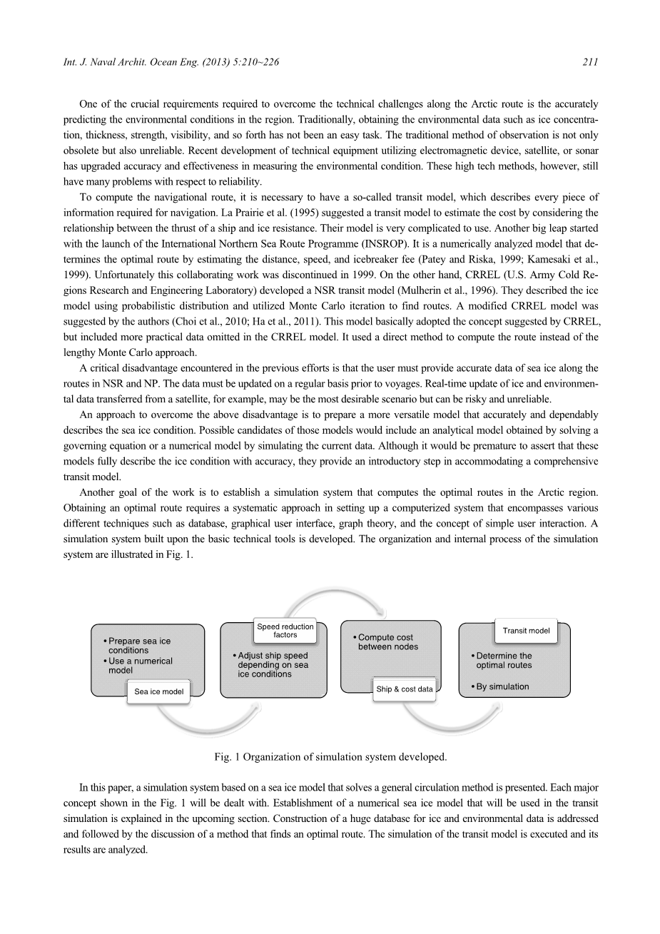 为了计算航行路线,有必要有一个所谓的过境模型,它描述了航行所需的每一条信息。La Prairie等人(1995)提出了一种运输模型,通过考虑船舶推力与冰阻力之间的关系来估算成本。他们的模型使用起来很复杂。另一项重大飞跃始于国际北海航线计划(INSROP)的启动。(Patey and Riska, 1999;Kamesaki等,1999)。不幸的是,这项合作工作在1999年停止。另一方面,CRREL (U.S. Army Cold Regions Research and Engineering Laboratory)开发了一个NSR过境模型(Mulherin et al., 1996)。他们利用概率分布描述了海冰模型,并利用蒙特卡罗迭代法寻找路径。作者提出了一种修正的CRREL模型(Choi et al., 2010;Ha等,2011)。该模型基本采用了CRREL提出的概念,但在CRREL模型中遗漏了更多的实际数据。它采用直接法来计算路线,而不是冗长的蒙特卡罗方法。