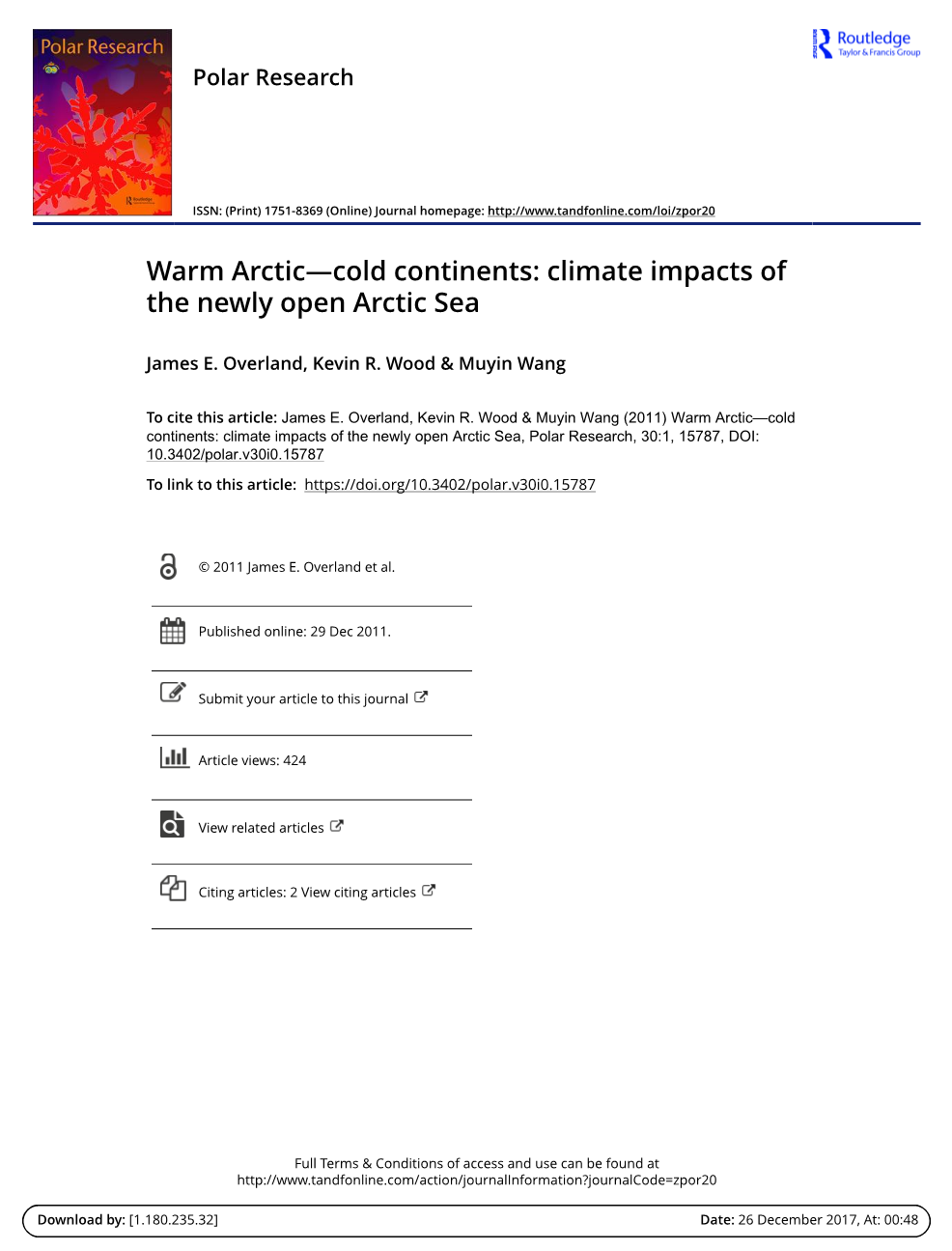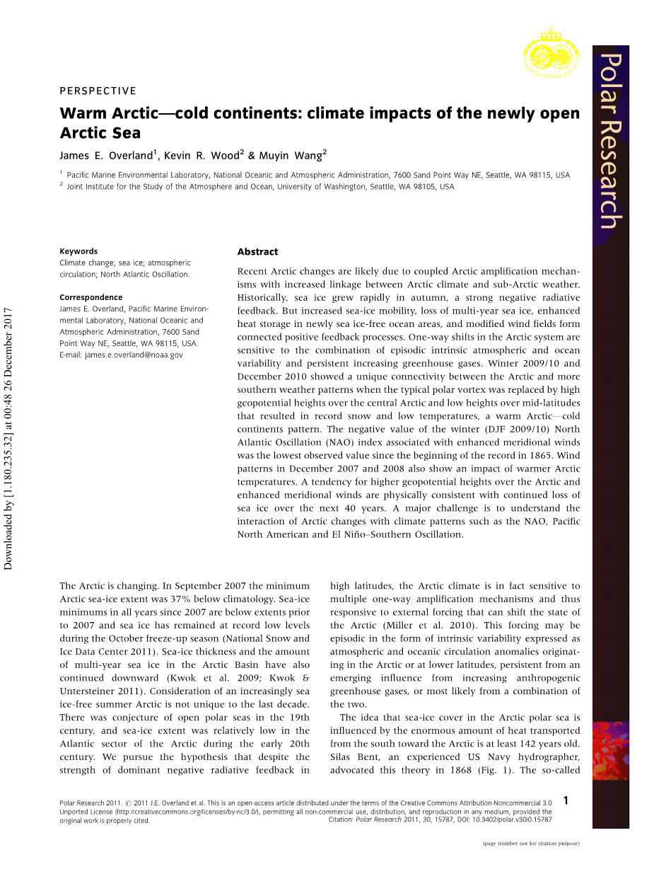 题 目:暖北极—冷大陆:新增北极开阔水域的气候影响