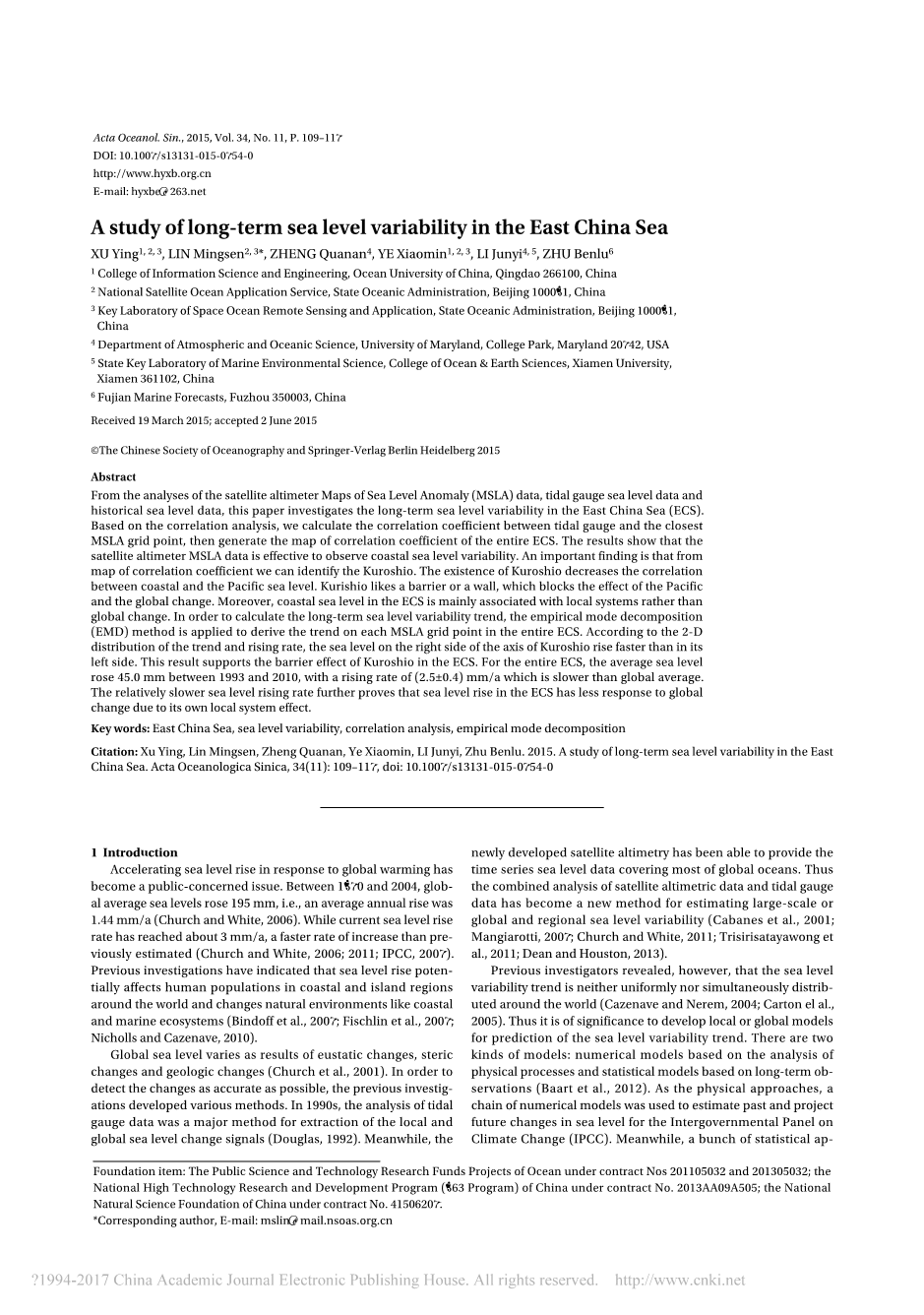 关键词:东海,海平面变化,相关分析,经验模态分解