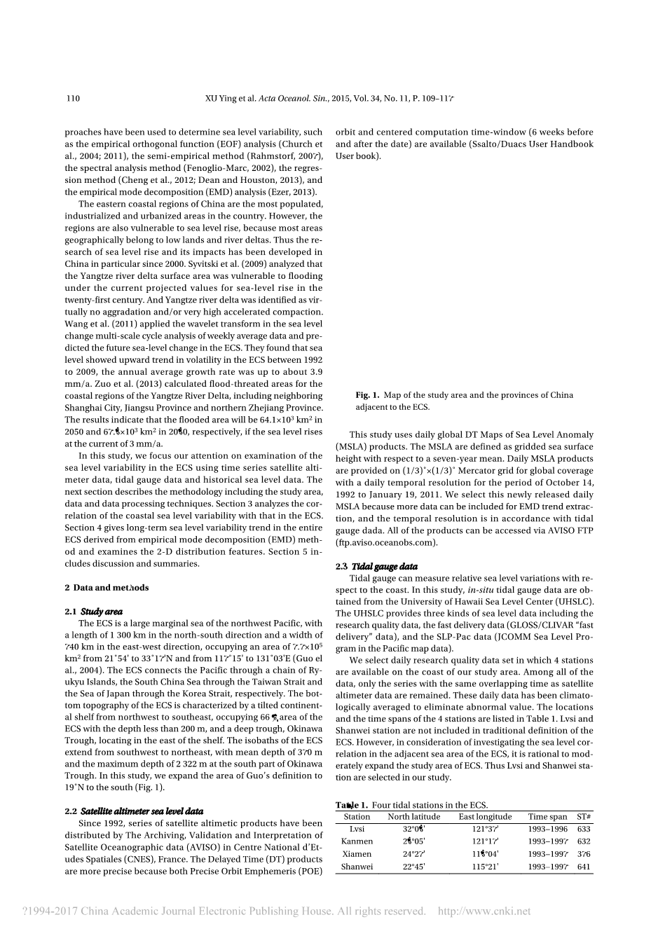 我们选择每日研究质量数据集,其中研究区海岸有4个站点可用。 在所有数据中,只剩下与卫星高度计数据具有相同重叠时间的系列。 这些日常数据在气候上平均以消除异常值。 表1列出了4个台站的位置和时间跨度。Lvsi和Shanwei台站不包括在ECS的传统定义中。 但是,考虑到调查海平面相关性在ECS的相邻海域,适度扩大ECS的研究区域是合理的。 因此在我们的研究中选择了吕氏和汕尾站。