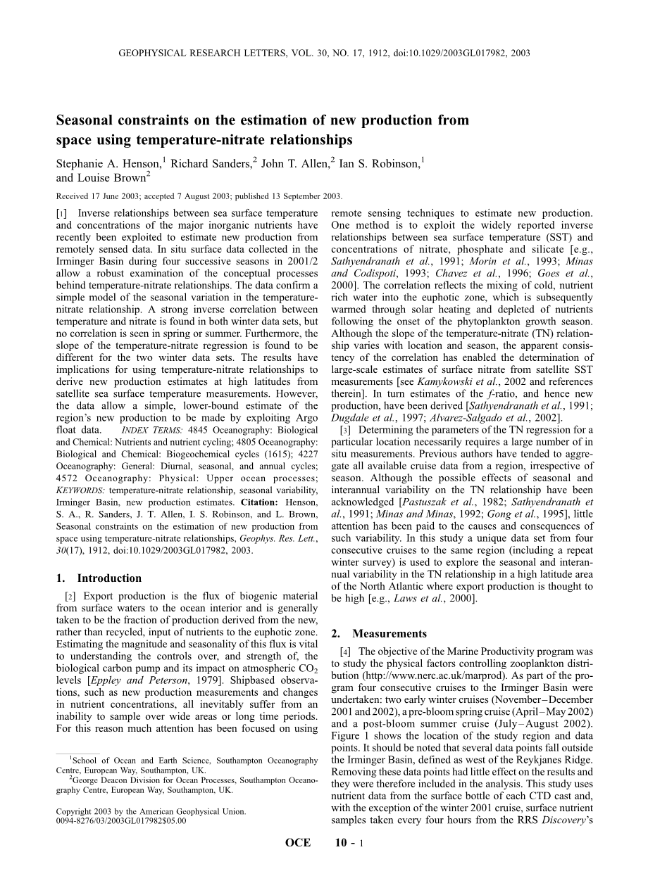 OCE 10 - 2 HENSON ET AL.: SEASONAL CONSTRAINTS ON THE ESTIMATION OF NEW PRODUCTION