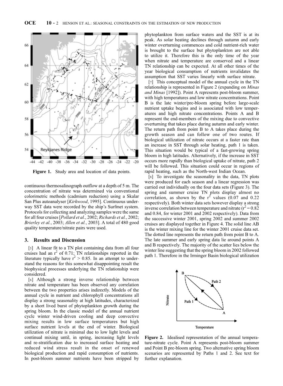 确定特定位置的TN回归的参数,必然要求大量的原位测量。以前的作者都倾向于从一个地区获取所有可用的巡航数据,不管季节如何。尽管季节性和年际变化对TN关系的可能影响已经得到承认。[Pastuszak et al., 1982; Sathyendranath et al., 1991; Minas and Minas, 1992; Gong et al., 1995], 人们很少注意到这种变化的原因和后果。在本研究中,我们使用了来自于同一地区(包括重复的冬季调查)的四次连续巡航的独特数据,来探索在北大西洋高纬度地区的TN关系的季节性和年际变化,在那里,出口生产量被认为是高的。 [e.g., Laws et al., 2000].