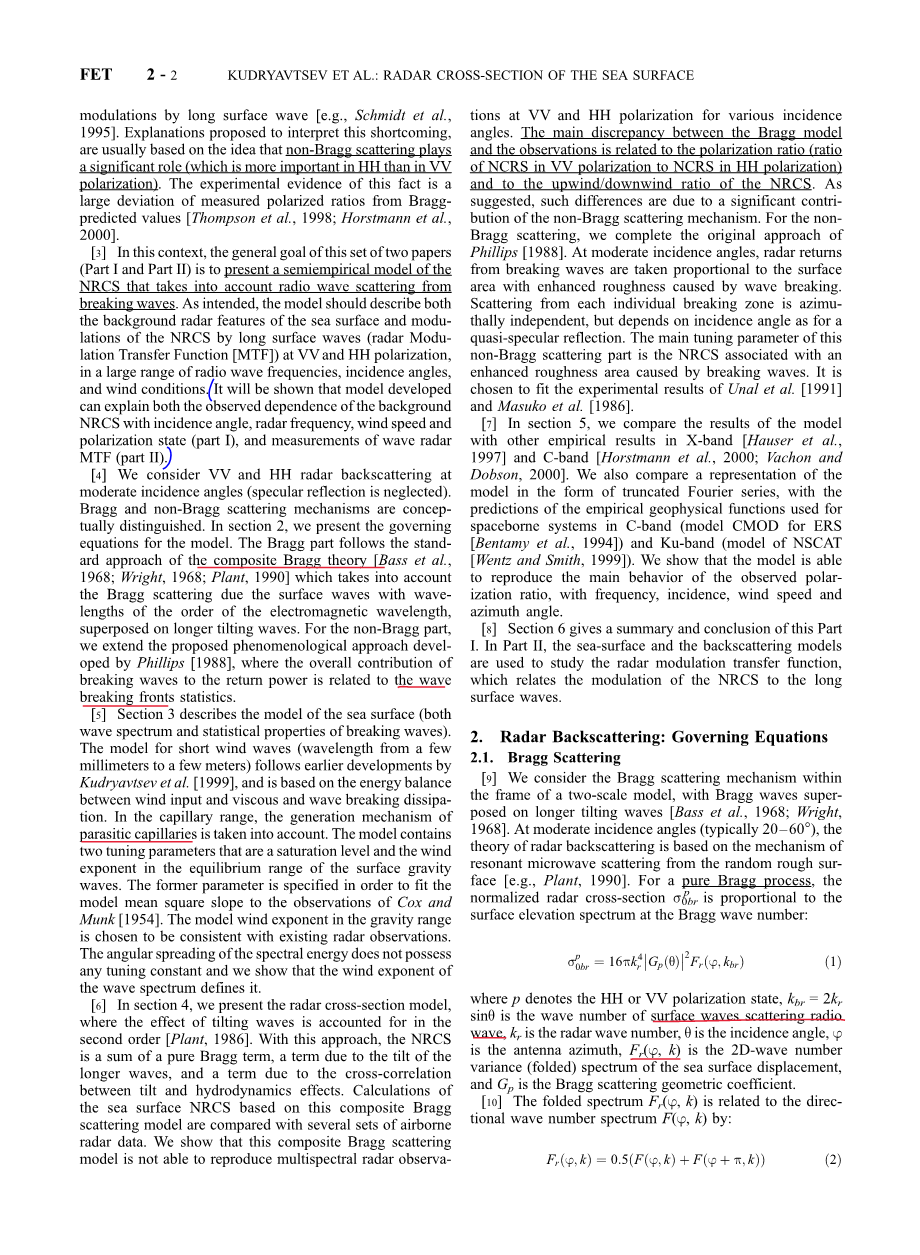 [6] 在第4节中,我们提出了雷达截面模型,其中倾斜波的影响在二阶中被考虑[Plant,1986]。 采用这种方法,NRCS是纯Bragg项(由于较长波的倾斜导致的项)和由于倾斜和水动力效应之间的互相关导致的项的总和。 基于这种复合Bragg散射模型的海面NRCS的计算与多组机载雷达数据进行比较。 我们表明,这种复合布拉格散射模型是不能够重现多种入射角度的VV和HH极化的多谱雷达观测观察。 布拉格模型与观测值之间的主要差异与极化比(VV极化中的NCRS与HH极化中的NCRS之比)以及NRCS的逆风/顺风比有关。如所暗示的那样,这种差异是由于非布拉格散射机制的显着贡献。 对于非布拉格散射,我们完成了Phillips[1988]的原始方法。 在适中入射角下,来自破碎波的雷达回波与由波浪破碎引起的粗糙度增加的表面面积成比例。每个单独破碎区域的散射是方位独立的,但取决于入射角作为准镜面反射。 这个非布拉格散射部分的主要调谐参数是NRCS与破碎波引起粗糙增加的面积有关,它被选择为适合Unal等[1991]和Masuko等[1986]的实验结果。