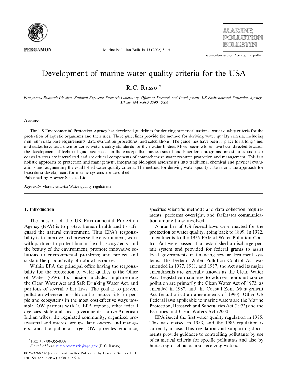 美国环境保护局已经制定了国家水质数值标准保护水生生物及其用途。这些指南提供了导出水质标准的方法,包括最低的数据库标准,数据评估程序和计算。这些准则已经存在了很长时间了,国家已经利用它们来获得水体的水质标准。综合水资源保护和管理的关键组成部分,是针对对于河口区域和沿海区域生态评估和生物标准的技术方向的成就。这是一个整体的保护和管理方法,将生物评估纳入传统的化学和物理评估并颁布了既定的水质标准。本文描述了提出水质标准的方法和海洋系统的生物标准开发的方法。