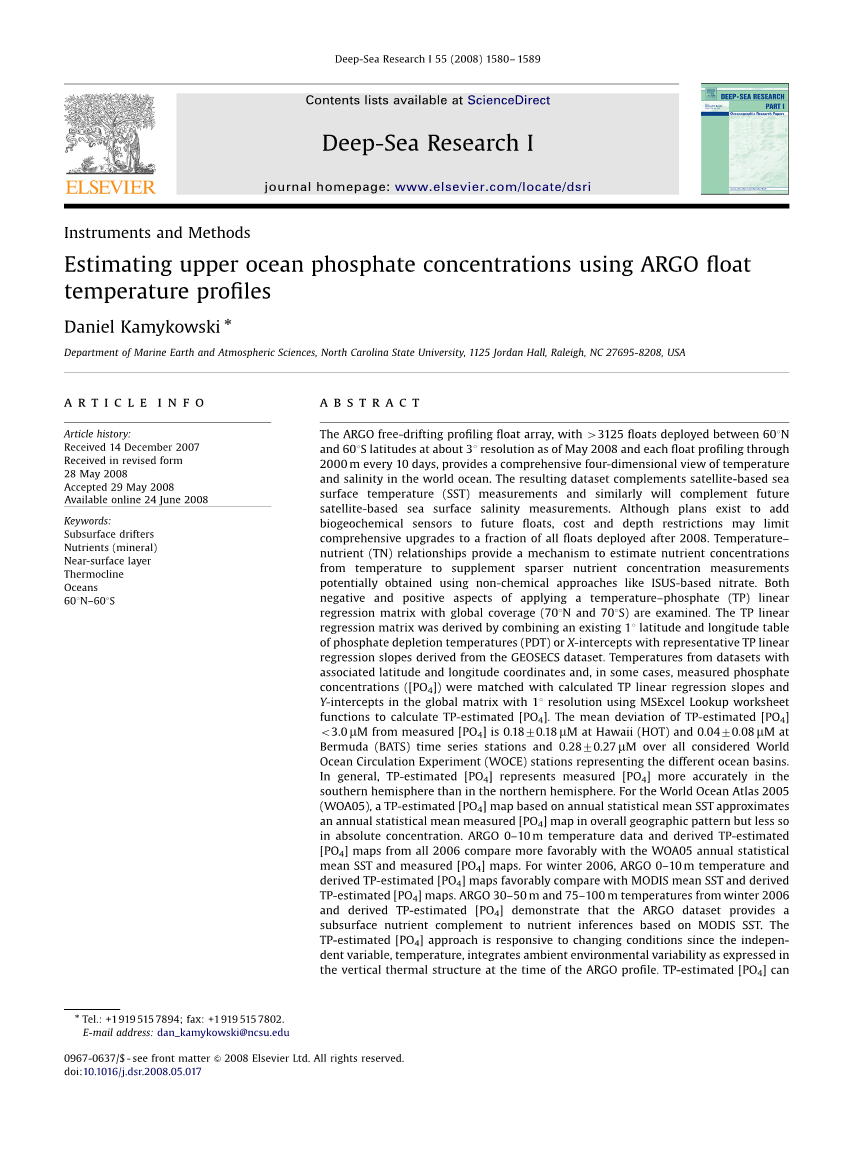 并且提供了世界海洋中温度和盐度的全面四维视图。由此产生的数据补充了基于卫星的海洋表面温度(SST)的测量,同样将补充未来基于卫星的海洋表面盐度测量。虽然计划为未来浮标添加生物地球化学传感器,但由于成本和深度的限制,只能全面升级2008年后部署的所有浮标中的一小部分的。温度 - 营养(TN)关系提供了一种利用温度估计营养物浓度的机制,以此补充使用非化学方法(如基于ISUS的硝酸盐)可能获得的更稀疏的营养物浓度测量值。检查了应用具有全局覆盖(70°N和70°S)的温度 - 磷酸盐(TP)线性回归矩阵的负面和积极方面。TP线性回归矩阵是通过将现有的11个纬度和经度磷酸盐耗尽温度(PDT)或X截距值与来自GEOSECS数据集的代表性TP线性回归斜率相结合得出的。来自具有相关的纬度和经度坐标以及在一些情况下测量的磷酸盐浓度([PO4])数据集的温度与计算的TP线性回归斜率和全局矩阵中的Y截距匹配,使用MSExcel查找工作表函数来计算TP- 估计[PO4]。TP-估计的[PO4] lt;3.0mu;M与测量的[PO4]的平均偏差在夏威夷(HOT)表现为0.18plusmn;0.18mu;M,在百慕大(BATS)时间序列站表现为0.04plusmn;0.08mu;M,在代表不同海洋盆地的所有考虑的世界海洋循环实验(WOCE)站中为0.28plusmn;0.27mu;M。一般来说,TP估计的[PO4]在南半球比在北半球能更精确地表示测量的[PO4]。 对于“2005年世界海洋图集”(WOA05),基于年度统计平均值SST的TP估计的[PO4]图相似于总体地理模式中的年度统计平均测量[PO4]图,但绝对浓度较低。2006年全部的ARGO 0-10m温度数据和推导的TP估计[PO4]图与WOA05年度统计平均SST和测量的[PO4]图比较更有利,对于2006年冬季,ARGO 0-10 m温度和推导的TP估计[PO4]图与MODIS平均SST和推导的TP估计[PO4]图相比有利。2006年冬天的ARGO 30-50m和75-100m的温度和推导的TP估计[PO4]表明ARGO数据集提供了基于MODIS SST的营养推论的表面营养补充。TP估计[PO4]方法对变化的条件作出反应,因为独立变量温度在ARGO剖面时可以将垂直热结构中所表达的环境变率综合起来。通过提供比单独的温度更多的可用性营养物的具体估计,TP估计[PO4]可以增强基于ARGO的生态系统应用的解释。
