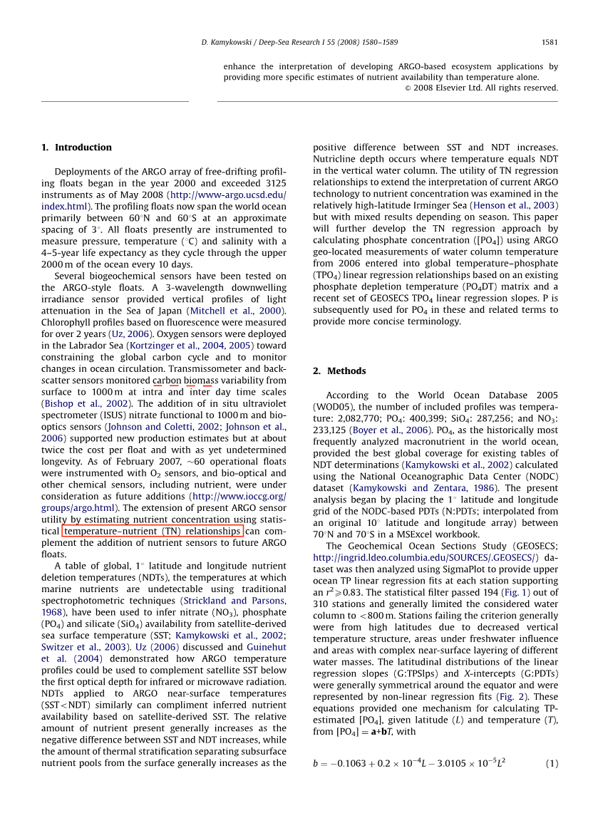 在全球1°纬度和经度营养物缺失温度(NDT)的表格中,使用传统分光光度技术检测到海洋营养物质的温度(Strickland和Parsons,1968)用于推断硝酸盐(NO3),磷酸盐(PO4) 和来自卫星衍生的海面温度的硅酸盐(SiO4)可利用性(SST; Kamykowski等人,2002; Switzer等人,2003)。使用传统的分光光度技术(Strickland和Parsons,1968)检测不到海洋养分的温度,被用来推断硝酸盐(NO3),磷酸盐(PO4) 和硅酸盐(SiO4)从卫星衍生的海洋表面温度(SST; Kamykowski等人,2002; Switzer等人,2003)的可用性。 Uz(2006)讨论和Guinehut et al。(2004)演示了如何使用ARGO温度曲线补充低于第一光学深度的红外或微波辐射的卫星SST。 适用于ARGO近地表温度(SSTlt;NDT)的NDTs类似地可以补充基于卫星导出的SST的推断的营养物利用度。营养物的存在相对量通常随着SST和NDT之间的负差异增加而增加,而从表面分离地下营养物池的热分层量通常随着SST和NDT之间的正差异增加而增加。在垂直水柱中温度等于NDT的地方发生螺旋线深度。 在相对高纬度的Irminger海(Henson等人,2003)中检查了TN回归关系的实用性,但是根据季节具有混合结果,将当前ARGO技术的解释扩展到营养物浓度。本文将进一步开发TN回归方法,通过使用ARGO地理位置测量的水柱温度从2006年进入全球温度磷酸盐(TPO4)线性回归关系,计算磷酸盐浓度([PO4]),基于现有的磷酸盐消耗温度 PO4DT)矩阵和最近的一组GEOSECS TPO4线性回归斜率。 P是随后在这些和相关术语中用于PO4以提供更简洁的术语。