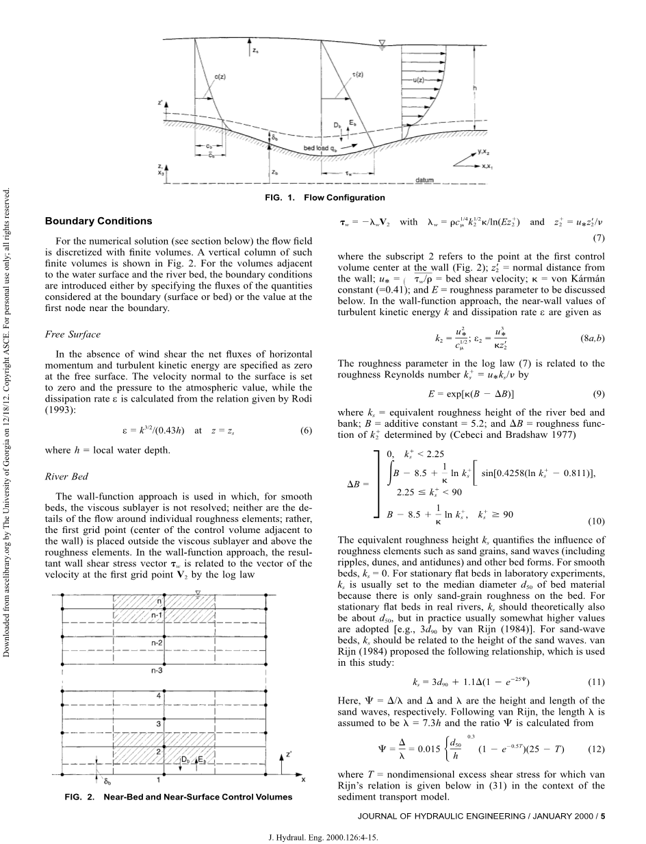 提出了一种用于计算明渠中的流动和泥沙运输的三维数值模型。通过求解具有 湍流模型的全雷诺平均Navier-Stokes方程来计算流动。对明渠流引入专门的自由表面和粗糙度处理;尤其是水位由从二维深度平均动量方程导出的二维泊松方程确定。泥沙的输运通过通用的带有沉积速度经验公式的对流扩散方程来模拟。该方程和流动方程用有限体积方法在自适应的非交错网格上数值求解。河床载荷输运用非平衡方法模拟,河床变形从整体质量平衡方程获得。本带泥沙的模型在具有由松散河床底带来的净夹带和净沉积的明渠流动情况下得到了测试。全三维总荷载模型则通过计算河床可移动的180度弯曲的渠道中的流动和泥沙输送来验证。所有算例和实验的吻合总体良好。