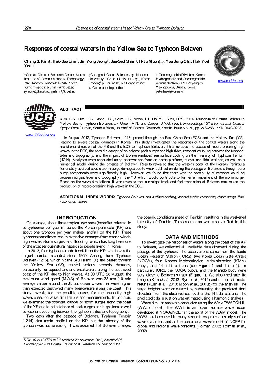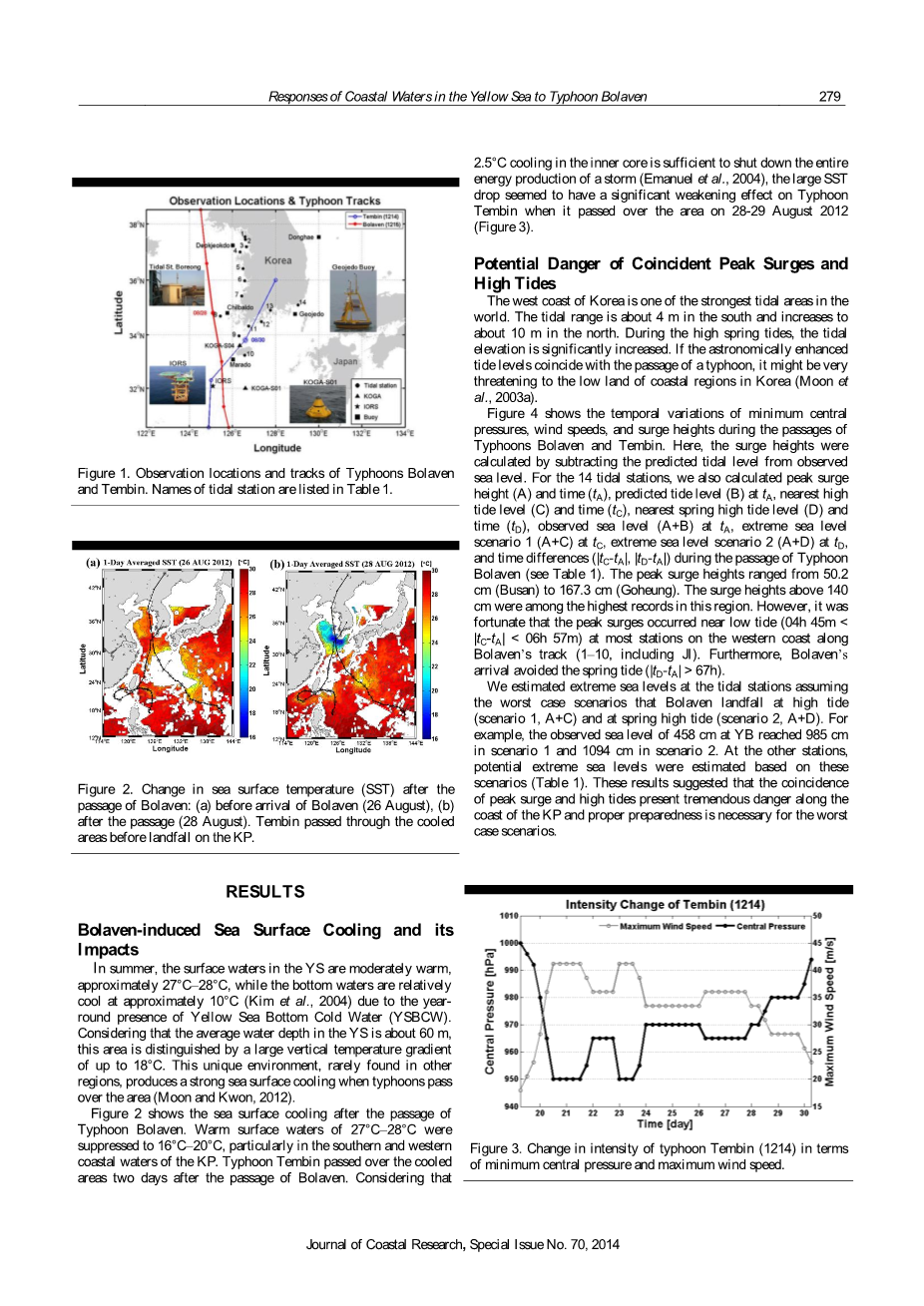 2012年,五个台风影响了韩国沿海水域,而其中三个台风在8月下旬至9月初朝鲜半岛登陆 这项调查的重点是沿海水域对台风布拉万(1215)的反应,这是2012年通过了东海和黄海,打击朝鲜半岛最强的,也导致了韩国严重的损失。 我们分析了海洋平台,浮标和潮汐站的观测数据以及布拉万通过期间的数值模拟结果。