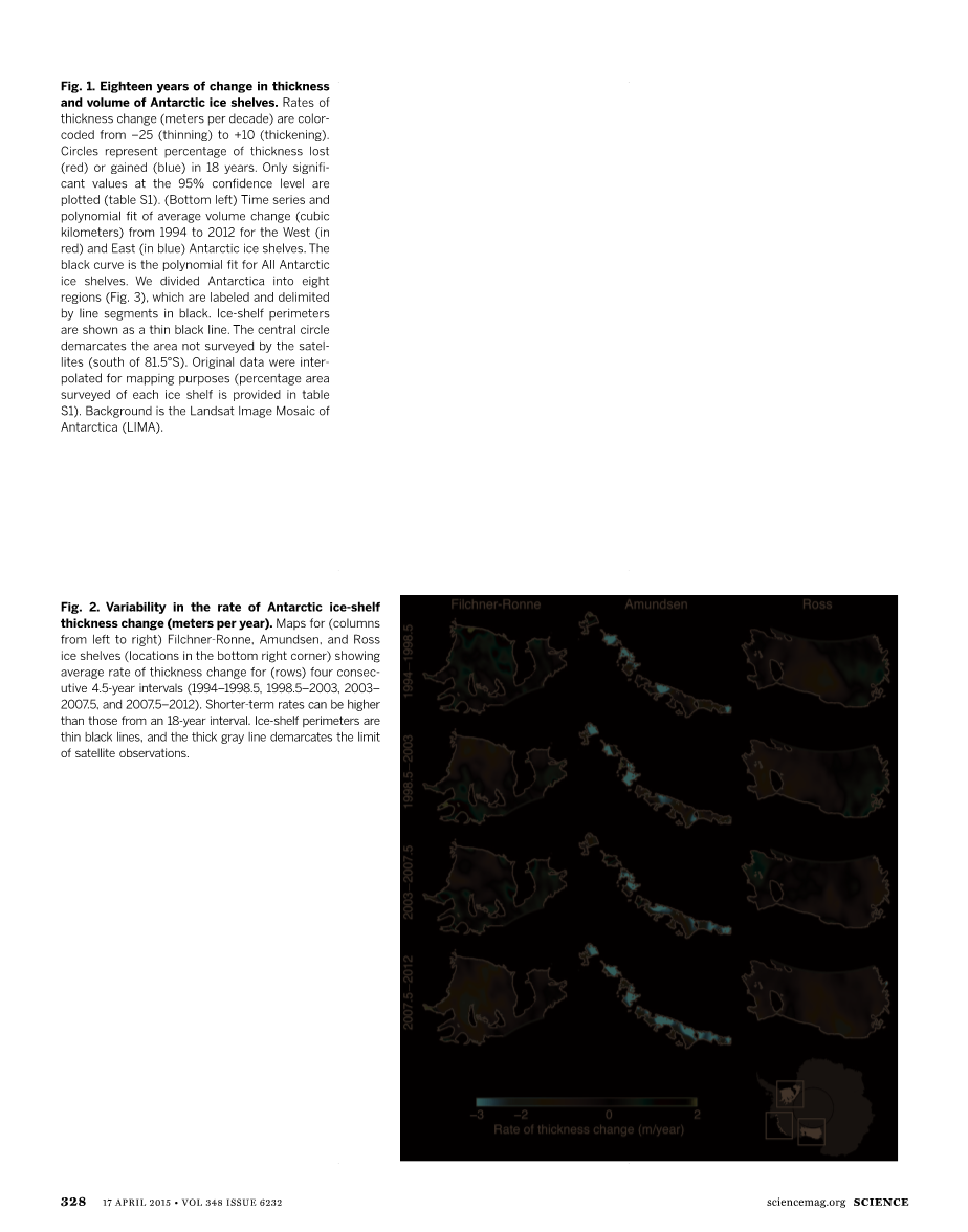 东南极冰架总体积在1994-2003年间以的速率增加,之后又以减少;而西南极冰架在18年间则为持续的体积损失,其中2003后的体积损失显著加快(图.1)。在2003年前后,西南极冰架体积损失率分别为和,相当于平均损失速率增长了70%。1994-2003年间,绕南极冰架总体积损失率微不足道(),而在2003年后损失率骤增至。总体上,1994到2012年间南极冰架体积平均变化速率为,平均增速为(2003-2012年期间为)。