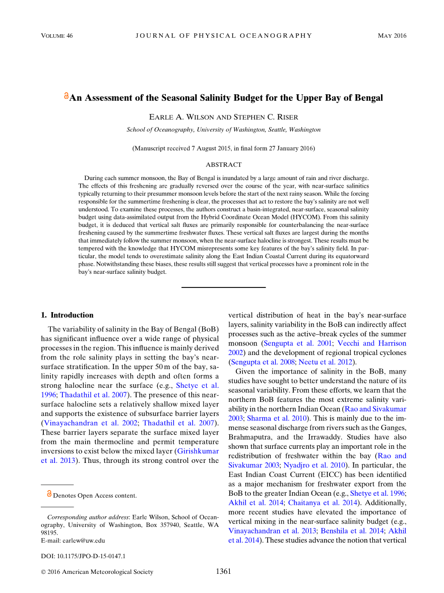 鉴于孟加拉湾盐度的重要性,许多研究试图更好地了解盐度的季节变化率。通过这些研究我们了解到孟加拉湾北部具有北印度洋最为极端的盐度变化(Rao and Sivakumar 2003; Sharma et al. 2010)。这主要是由于诸如恒河,雅鲁藏布江和伊洛瓦底德等河流的季节性淡水注入。研究还表明,表面流对于海湾内的的淡水在分配起到重要作用。(Rao and Sivakumar 2003; Nyadjro et al. 2010)。特别是东印度沿岸流(EICC)被认为是淡水从孟加拉湾到更大的印度洋的出口。此外,很多近期的研究开始重视近表层垂直混合在盐度收支中的作用(e.g., Vinayachandran et al. 2013; Benshila et al. 2014; Akhil et al. 2014)。这些研究提出了垂直盐度通量对夏季季风后近表层盐度的恢复起到关键作用。