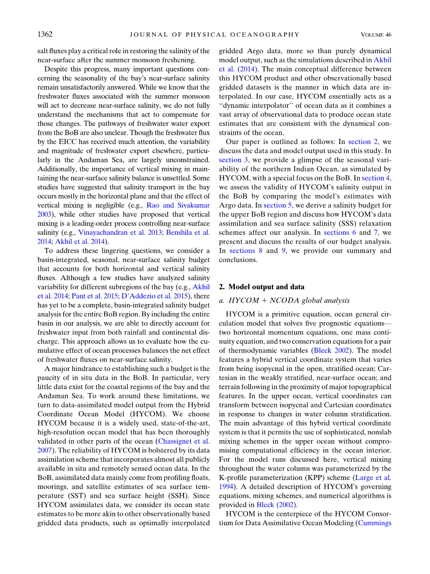 我们的论文提纲如下:在第2节中,我们讨论了本研究中使用的数据和模型输出。在第3节中,我们提供了一个由HYCOM模拟的北印度洋季节变化情况,特别关注孟加拉湾。 在第4节中,我们通过将模型的估计与Argo数据进行比较,来评估HYCOM在孟加拉湾中的盐度输出的有效性。在第5节中,我们得出了孟加拉湾上层海区的盐度收支,并讨论了HYCOM的数据同化和海面盐度(SSS)如何影响我们的分析。 在第6和第7节中,我们展示并讨论了我们的收支分析结果。在第8和第9节,我们提供了我们的总结和结论。