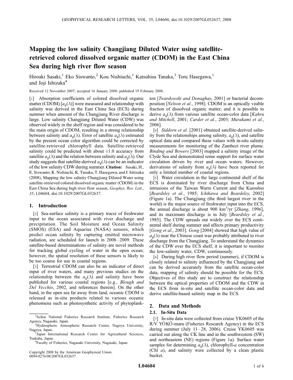 基于卫星可溶性有机物(CDOM)对高径流季节东海低盐度长江冲淡水的识别外文翻译资料