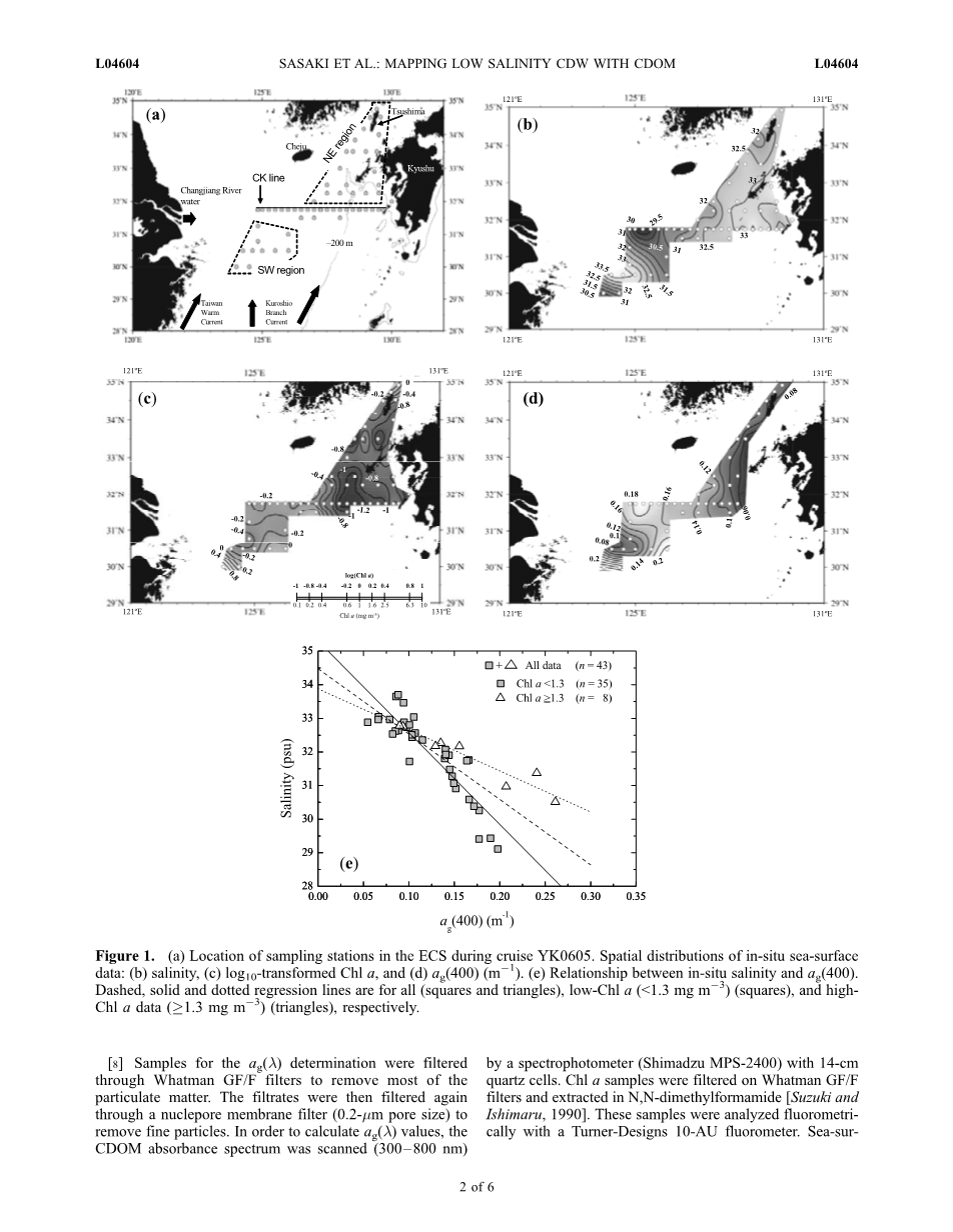 原位数据来源于夏季(2006年7月11日至28日)R / V YOKO-maru(渔业研究机构)YK0605航次东海航段。YK0605航次沿CK线在西南(SW)和东北(NE)地区(图1a)进行。用干净塑料桶收集的表层水样品用于测定ag(lambda;),叶绿素a浓度(Chl a)和盐度。