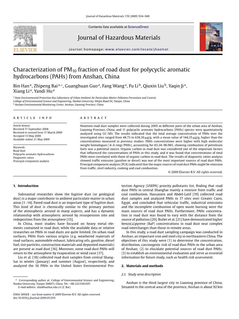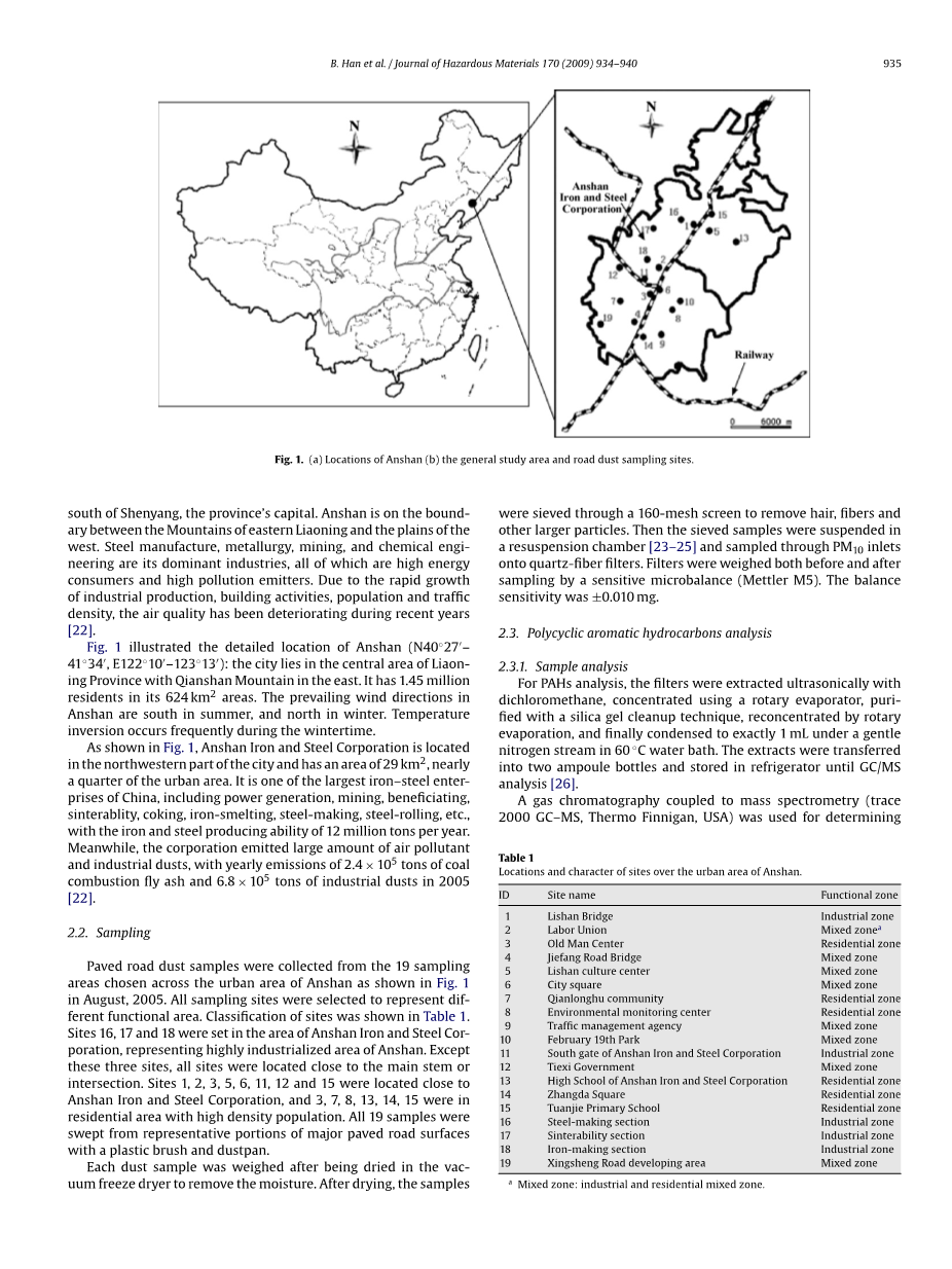 大量研究表明,这些扬尘(或地质粉尘)是城市环境颗粒物的主要贡献者。 铺设的道路积尘是一种重要的逃逸灰尘。 这种粉尘在许多方面与大气气溶胶的主要部分有相似的化学组成,与大气中的重悬浮和再沉积的大气气溶胶具有动态关系。 在中国,大多数研究集中在路面积尘中所含的重金属元素,而有关道路积尘中多环芳烃的现有数据或相关研究相当有限。 在城市路面上,作为道路积尘,存在着各种各样的多环芳烃(如路面风化材料,汽车尾气,润滑油,汽油,柴油,轮胎颗粒,建筑材料和沉积材料)。 此外,一些道路积尘中多环芳烃将通过蒸发或风起来返回大气。Liu et al分别在冬季(1月)和夏季(8月)从上海中部收集了道路积尘样品,并分析了美国环境保护局(USEPA)优先污染物清单中的16种PAHs,发现道路积尘中PAHs 主要是交通和煤炭燃烧的混合物。哈桑尼和阿卜杜勒 - 拉蒂夫收集了道路积尘样本,并分析了埃及大开罗17个地点的多环芳烃,并得出结论,车辆交通,工业排放和不完全燃烧的露天废物燃烧是道路积尘多环芳烃的主要来源。 此外,发现道路积尘多环芳烃浓度随着距离污染源的距离而变化。Butler等人在复杂交叉口附近的路面积尘中显示出比偏远地区更高的苯并(a)芘(BaP)浓度。这项研究,在中国东北部重要的钢铁城市鞍山进行了道路除尘采样活动。 本研究的目的是(1)确定鞍山市区道路积尘多环芳烃浓度,分布,致癌风险; (2)阐明道路尘埃PAH的潜在来源; (3)建立环境评估,作为未来研究的基本信息,如健康风险评估。