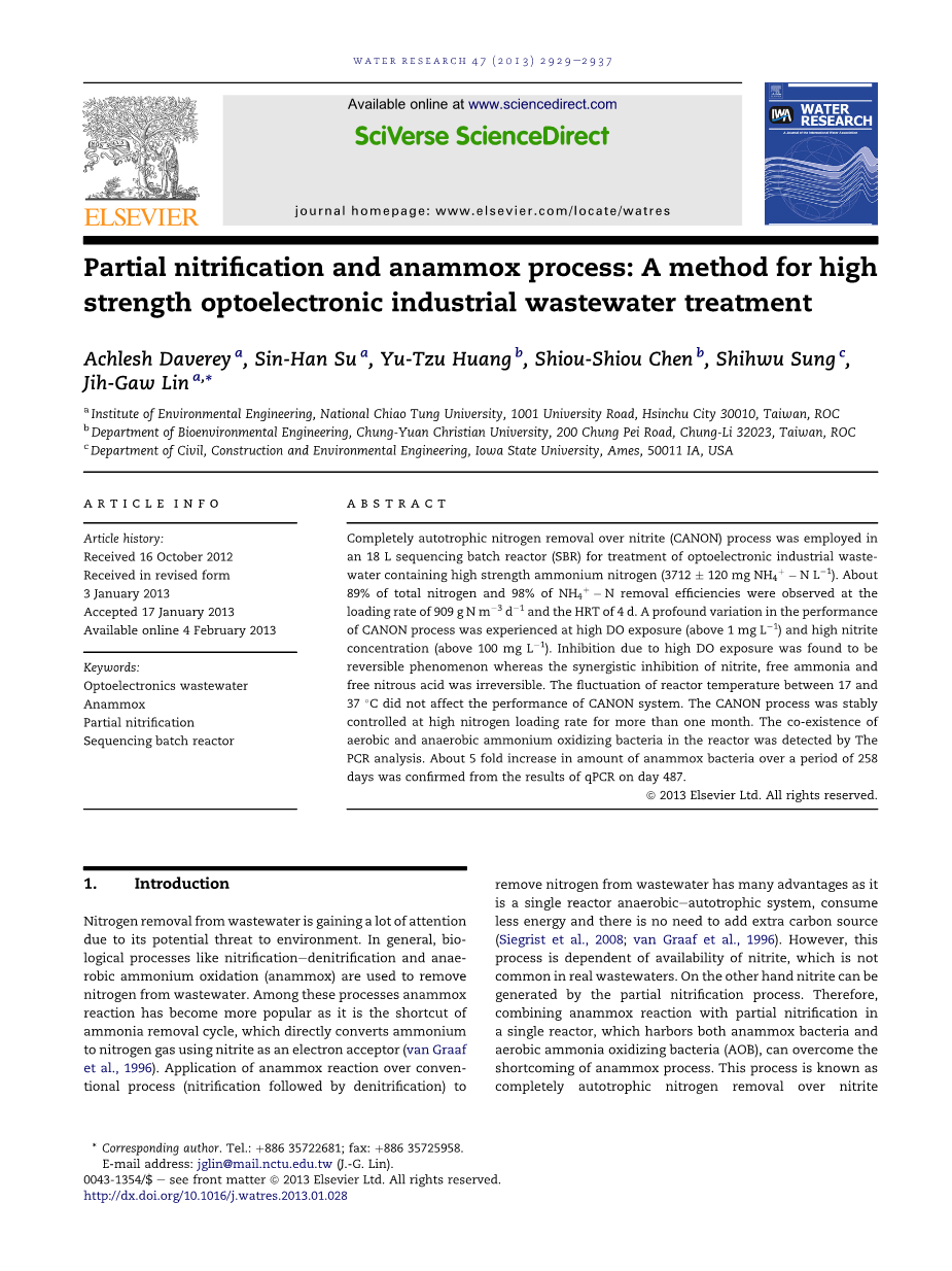 关键词:光电废水;厌氧氨氧化;短程硝化;序批式反应器。