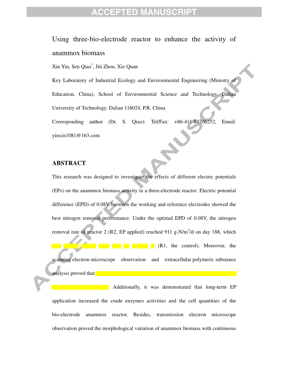 摘要:本论文的目的在于探讨在三电极反应器中不同电极电势(EPs)对厌氧氨氧化菌活性的影响。其中,当工作电极和参比电极两者的电极电势差为0.08V时,脱氮性能最好。当小于最佳电极电势差(EPD)0.08v时,反应器2(R2, 利用电极电势)氮的去除率在188天时达到911g-N/m3/d,比反应器1(R1)高25.3%。而且,根据扫描电镜结果和对胞外聚合物的分析,表明利用电极电势有利于电极表面的厌氧氨氧化菌生长。此外,研究表明生物电极厌氧氨氧化反应器中,长期利用电极电势,有效增强原始酶的活性和增加细菌的数量。另外,根据透射电镜扫描结果显示了厌氧氨氧化菌在连续运用电极电势下的形态变化。