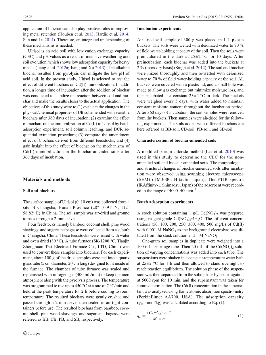 红壤是阳离子交换量和pH值较低的酸性土壤(CEC),由于强烈风化而土壤演化,其显示对重金属较低的吸附能力(Jiang 2012a; Jiang and Xu 2013)。热解碱性生物炭是可以减轻低pH值的酸性土壤。在本研究中,选取红壤测试不同生物碳对Cd(II)的固定效果。此外,添加生物炭后较长时间的孵化,引导稳定的反应使土壤和碳之间的反应结果更接近实际应用。这个本研究的目的是(1)评估经过360天孵化的后的变量生物碳对红壤的物理/化学性质的改进;(2)检查生物炭对Cd(II)在红壤固定批量吸附实验、土柱淋溶和BCR提取程序的效果;(3)比较修改来自不同的原料的生物碳效应;(4)了解经过360天孵化生物质炭对土壤的Cd(II)的固定及土壤改进作用机制。
