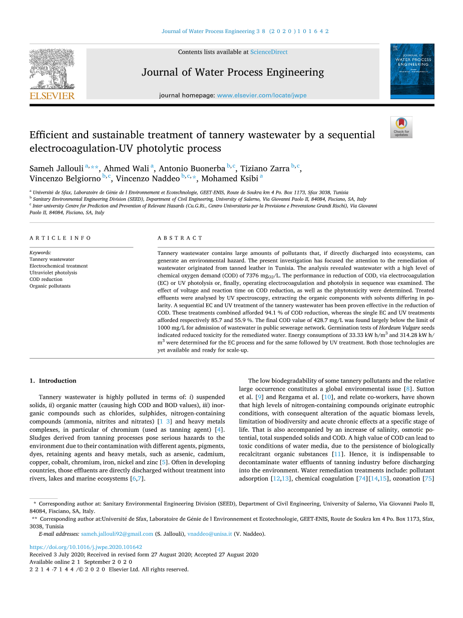 摘要:制革废水含有大量污染物,如果直接排放到生态系统中,会产生环境危害。本次调查的重点是突尼斯制革废水的治理。分析显示废水的化学需氧量高达7376 mg/L。通过电凝法或紫外光解法,或最后依次进行电凝法和光解法来降低化学需氧量。测定了电压和反应时间对化学需氧量降低的影响以及植物毒性。通过紫外光谱分析处理后的废水,用极性不同的溶剂提取有机成分。制革废水的序贯电化学和紫外光处理已被证明能有效降低化学需氧量。这些处理组合提供了94.1 %的化学需氧量的减少,而单一的电子商务和紫外线处理分别提供了85.7%和55.9%。最终的化学需氧量值为428.7mg/L,大大低于公共污水网络接纳废水的1000 mg/L限度。大麦种子的发芽试验表明,修复后的水毒性降低。确定了电解工艺的能耗为33.33kw·h/m3,紫外线处理后的能耗为314.28 kw·h/m3。这两种技术现在都可以使用,并可以进行扩展。