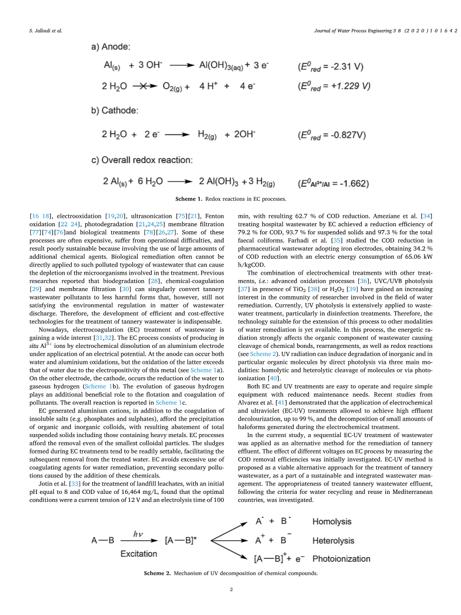 电化学处理与其他处理的结合,即:在二氧化钛[38]或过氧化氢[39]存在下的高级氧化过程[36]、UVC/UVB光解[37]在水修复领域的研究人员中引起了越来越大的兴趣。目前,紫外光解广泛应用于废水处理,尤其是消毒处理。因此,适合将这一过程扩展到其他形式的水修复的技术仍然是可用的。在此过程中,高能辐射强烈影响废水的有机成分,导致化学键断裂、重排以及氧化还原反应(方案2)。紫外辐射可以通过三种主要方式直接光解诱导无机分子,特别是有机分子的降解:分子的同解和异解裂解或通过光电离[40]