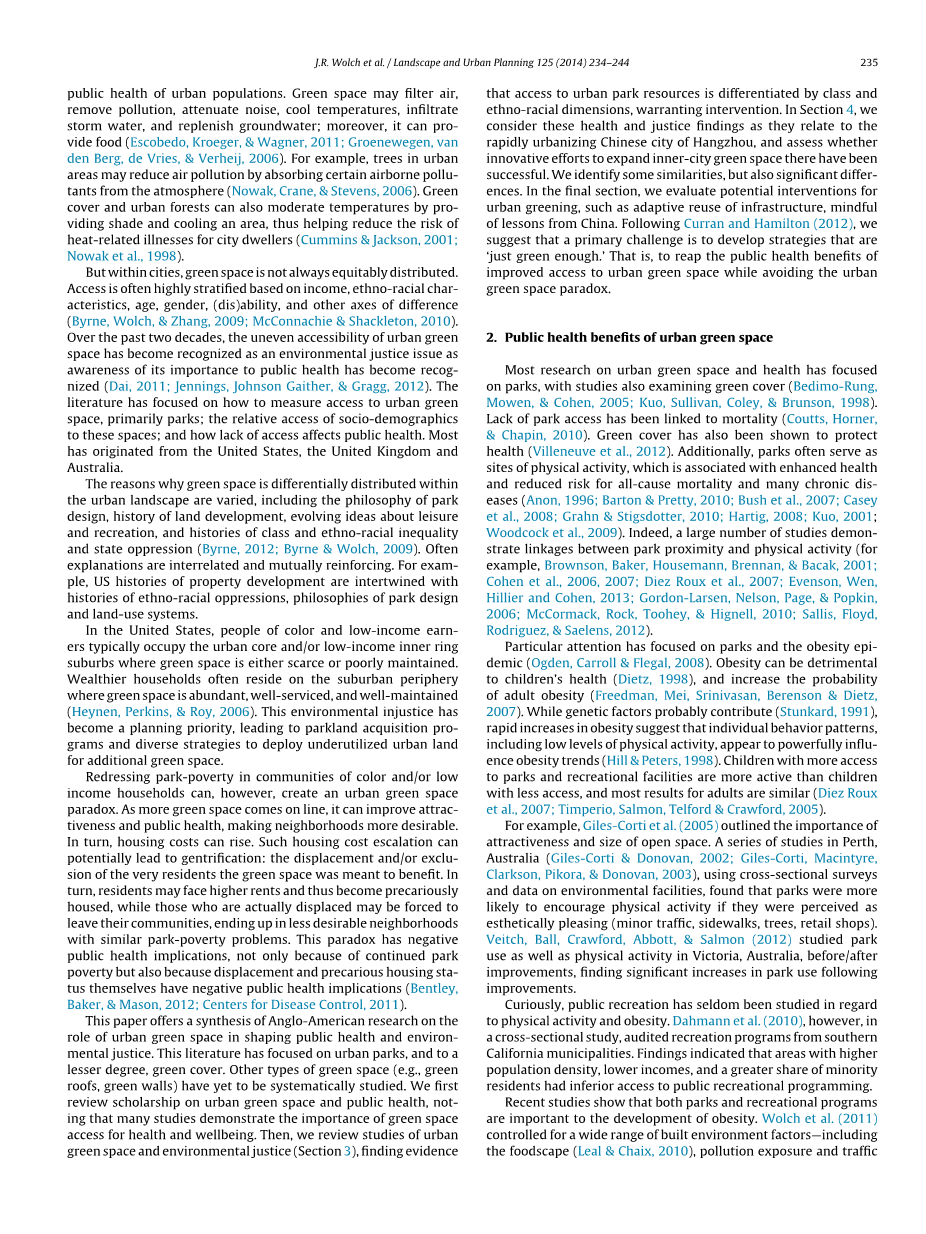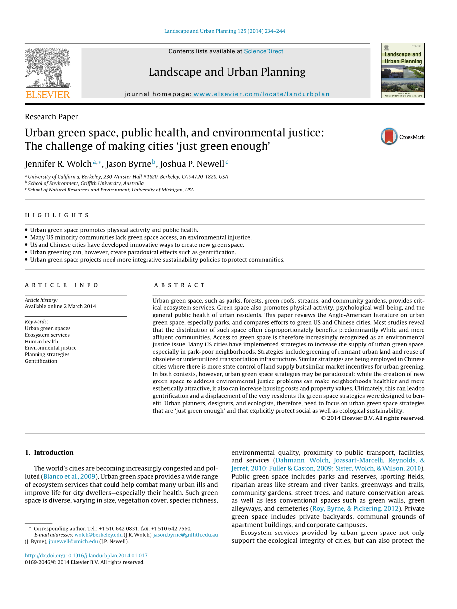 但城市内绿地并不总是公平的分配。获取往往是在收入的基础上高度分层的,民族,种族特征,年龄,性别,残疾和不同的其它轴(Byrne, Wolch, amp; Zhang, 2009; McConnachie amp; Shackleton, 2010)。过去二十年间,参差不齐的城市绿地已成为公认的环境正义问题,作为其重要的公共健康意识已成为公认的(Dai, 2011; Jennings, Johnson Gaither, amp; Gragg, 2012)。文献主要集中在如何衡量获得城市绿地,公园为主;社会人口统计到这些空间相对接;缺乏会如何影响公众健康。很多起源于美国,英国和澳大利亚。
