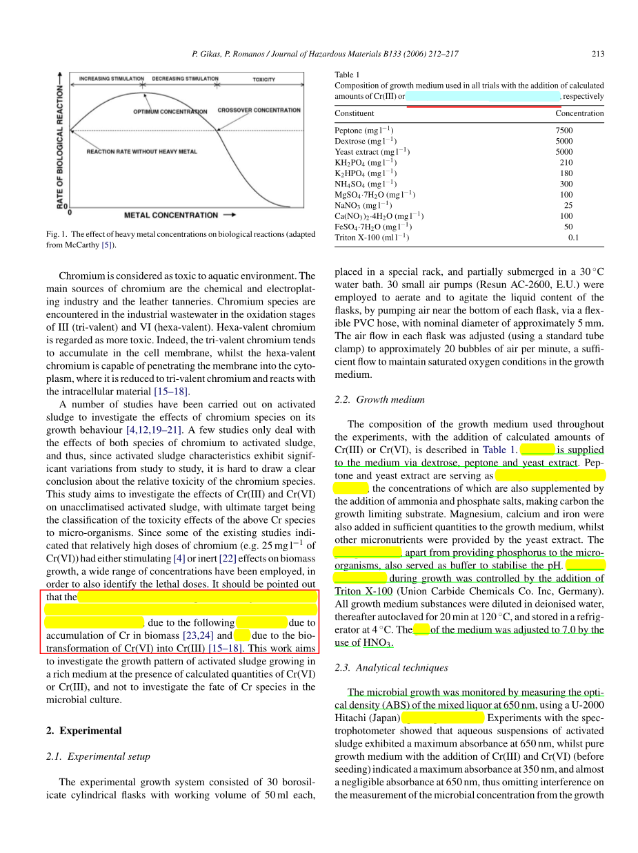 一般来说,重金属是公认的抑制微生物生长的有毒物质[1,2],虽然他们的增长通常受到微生物对重金属选择性的影响[3,4]。早在1964年由麦卡锡绘制的图[5](图1)完美的证实了微生物对重金属元素存在的相应影响,他根据重金属浓度间的关系将其效果分为三类:(1)刺激增加的区域,(2)刺激减少的区域和(3)有毒区域。添加少量重金属的细胞环境通常有利于细胞生长,当超过最优浓度时就会发现有一个相应的刺激使之减少。重金属浓度的进一步增加不会对细胞的生长产生不利影响,直到微生物活性和系统的故障的完全恢复。曲线的临界点和形状如图所示。没有临界点和图1中的曲线的形状,因而,只取决于微生物的类型和特定的重金属,随着时间的推移,微生物能适应相对较高的重金属浓度,这种现象被称为驯化。适应通常涉及使用替代代谢途径,不中断(或至少破坏程度较轻),重金属的存在等几个方面。然而,这个过程是有限的,细胞可能无法进一步适应相对较高的浓度,导致生物活性被控制[6,7]。当重金属应用于混合培养系统,如活性污泥系统,由于过程中存在的微生物多样性较高,可能具有更好的耐受性。因此,一些物种可能会受到显著影响,而其他却能很快适应新的环境[8]。尽管上述现象的研究相当广泛,科学界还没有明确地得出是否存在特定的重金属抑制或刺激微生物生长。