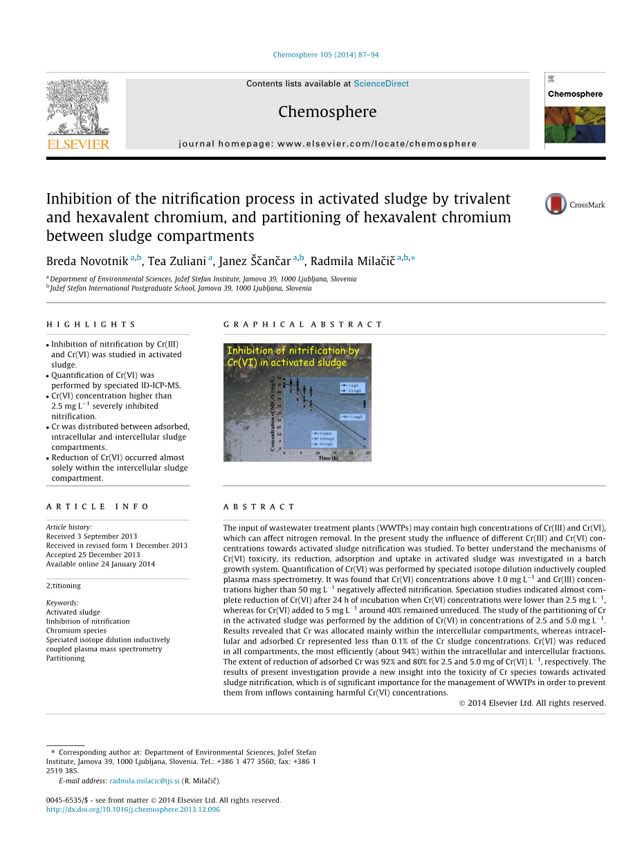 Cr(III)和Cr(VI)毒性的数据是相互矛盾的。活性污泥中铬形态信息缺乏。为了更好地理解Cr(VI)毒性的机理,我们工作的目的是减少,吸附和上升管Cr(VI)的活性污泥潜伏和评估浓度溶解Cr(III)和Cr(VI)对硝化作用是否有毒。
