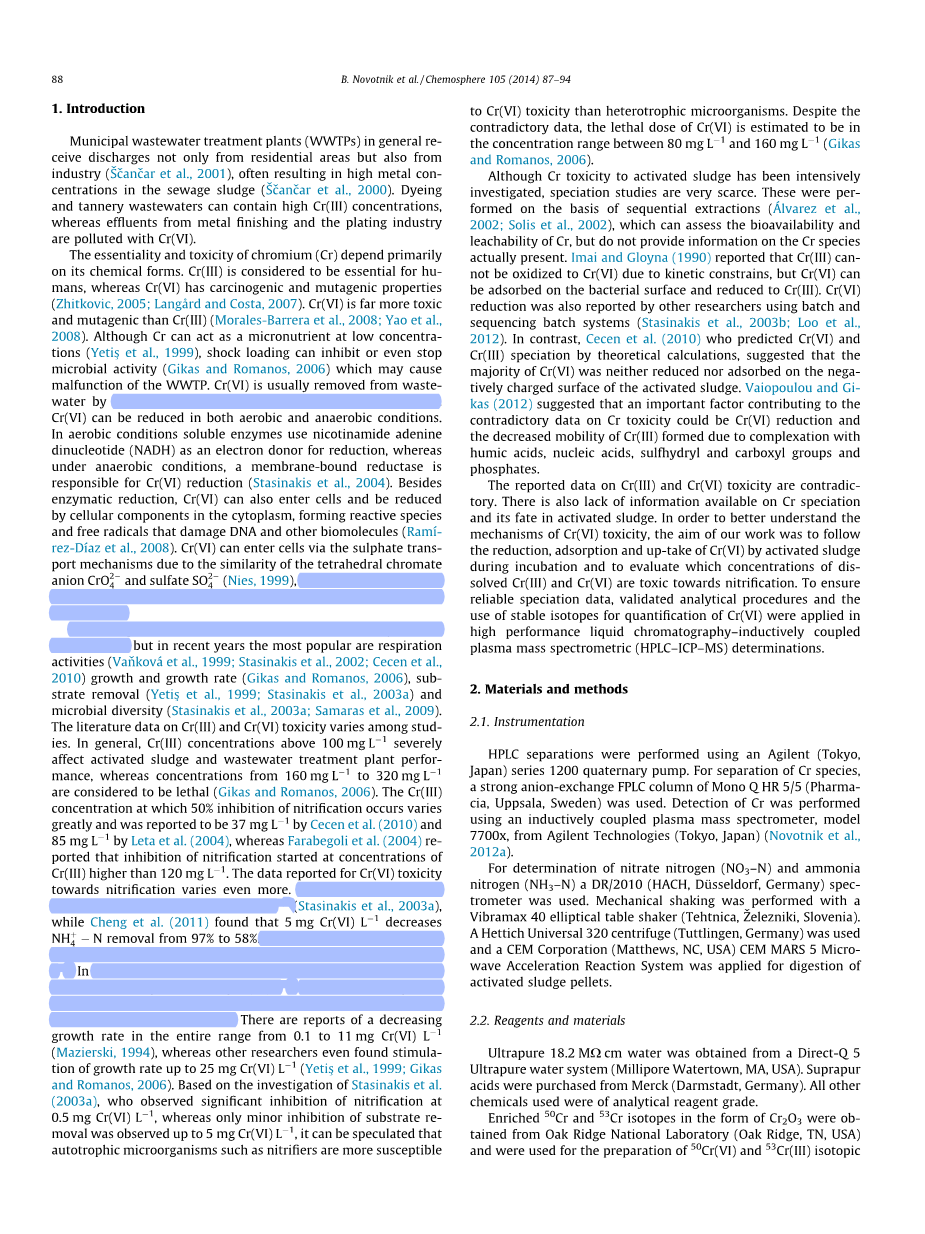在滤液中Cr(VI)浓度由物种特异性同位素稀释和高效液相色谱-电感耦合等离子体质谱仪确定的。在我们以前的工作中确定所述计算的Cr(VI)的浓度比率50/52(R50/52)(Novotnik 等人,2012c)。铬浓度用ICP-MS测定,在10秒的基础上确定的定量是0.130mg/Kg Cr(VI)和0.007mg/Kg活性污泥。Cr(VI)和总铬的测量标准偏差分别为4%和2.5%。