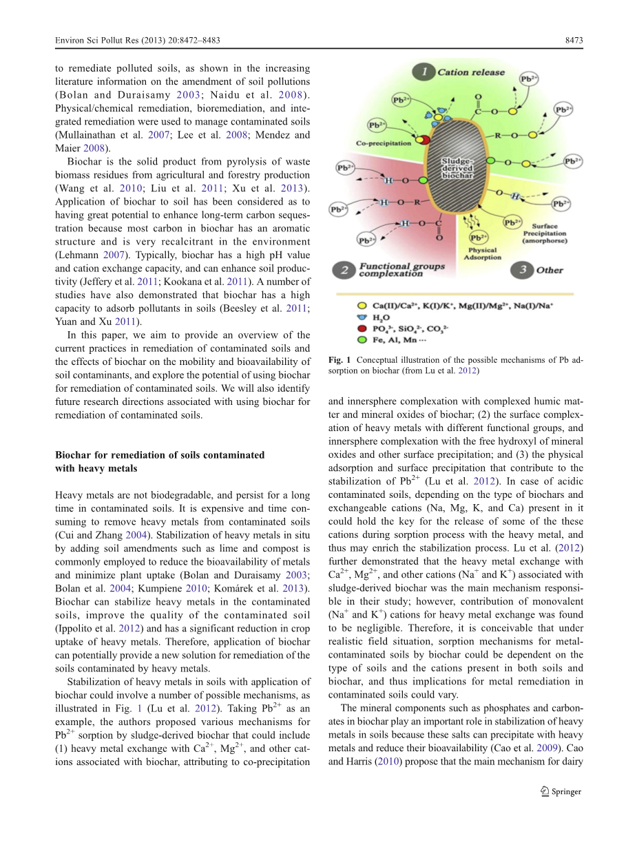 生物炭稳定土壤中的重金属的应用可能涉及许多可能的机制,如图1中所示。以Pb2 为例,作者提出了污泥衍生生物炭吸附Pb2 的各种机制,可能包括(1)重金属与Ca2 、Mg2 ,和其他阳离子与生物炭的交换。由于内层络合物与多元生物炭的复合体腐殖质物质和无机氧化物共同沉淀;(2)重金属表面络合物具有不同的官能团,内层络合物与矿物的自由羟基氧化物和其他表面沉淀;(3)物理吸附和表面沉淀有助于Pb2 的稳定。在酸性土壤污染的情况下,根据生物炭的类型和可交换阳离子(钠、镁、钾和钙)出现在它可以释放这些阳离子与重金属的吸附过程中,因此可以丰富稳定过程。Lu et al(2012)在他们的研究中进一步证明了重金属与Ca2 、Mg2 离子交换,与污泥中生物炭其他阳离子(Na 和K )联系在一起的主要机制;然而,被发现的为重金属阳离子交换单价的贡献(Na 和K )可以忽略不计。因此,可想而知,在现实领域形势下,生物炭对重金属污染土壤的吸附机制可能依赖于土壤的类型和土壤中存在的阳离子和生物炭。因此对受金属污染的土壤修复可能会有所不同。生物炭中磷酸盐和碳酸盐等矿物成分在重金属土壤稳定过程中发挥着重要作用,因为这些盐能沉淀重金属和降低其生物利用度(Cao et al,2009)。Cao和Harris(2010)提出,牛粪生物炭的主要机制是不溶性的沉淀Pb磷酸盐从而有效保留Pb。一般来说,在制造生物炭时,当加热到200℃,水溶性P、Ca、Mg增加,但减少温度升高时,可能会增加Ca-Mg-P的结晶,当热解温度增加到500℃就是证明磷钙矿(Ca3(PO4)2、Mg3(PO4)2)的形成,从而促使铅的降水(Cao和Harris,2010)。碱度的生物炭还可以促进土壤重金属沉淀。Chen和Xu(2009)回顾了在文献中各种原料获得生物炭的平均pH值为8.1。相同的原材料,由于生物炭的灰分含量增加,生物炭pH值随热解温度增大(Wu et al,2012)。因此,大多数生物炭是碱性物质和石灰的效果,这有助于减少污染土壤中重金属的迁移。然而,相同类型的生物炭吸附能力随不同类型的重金属变化。
