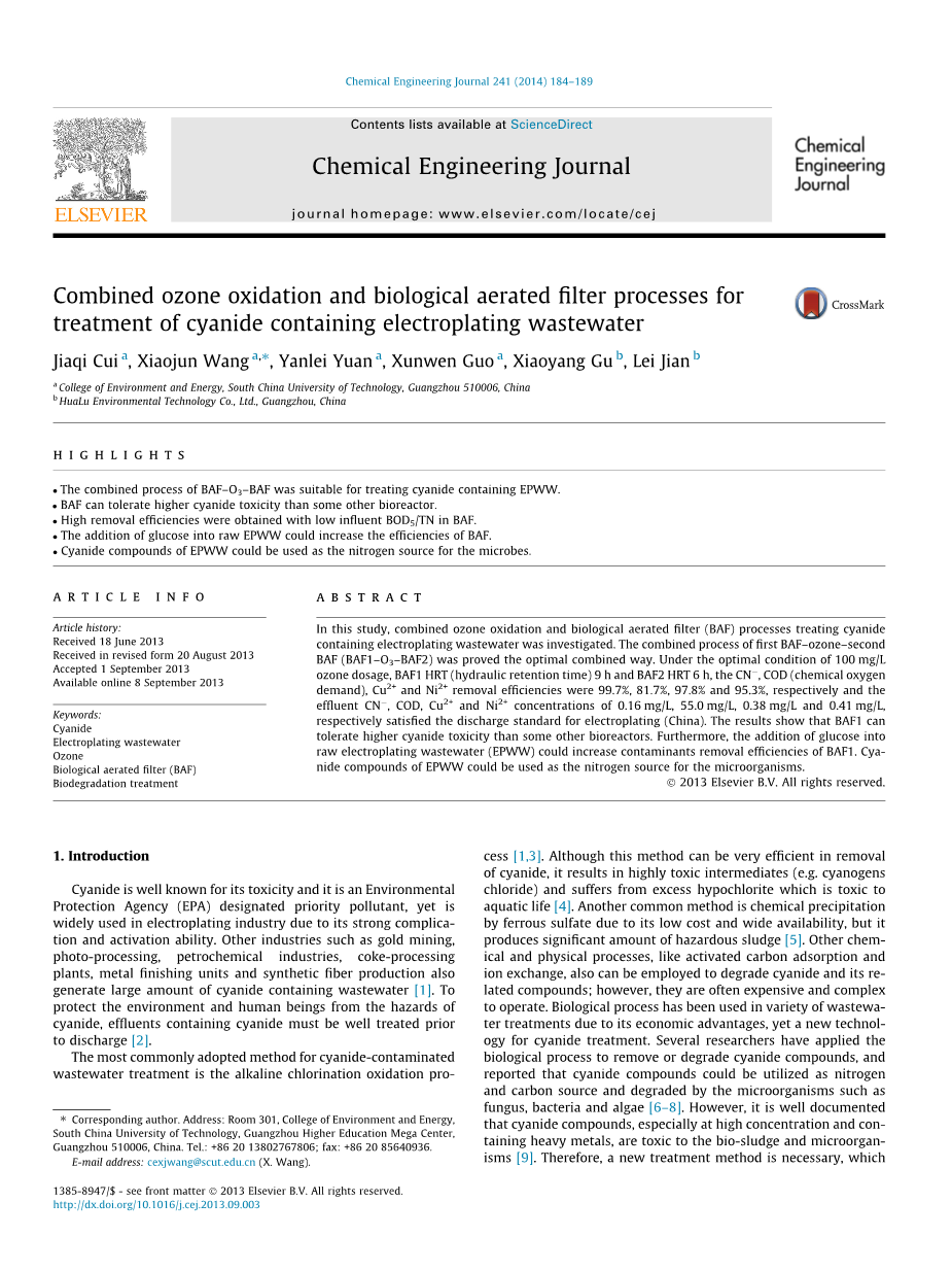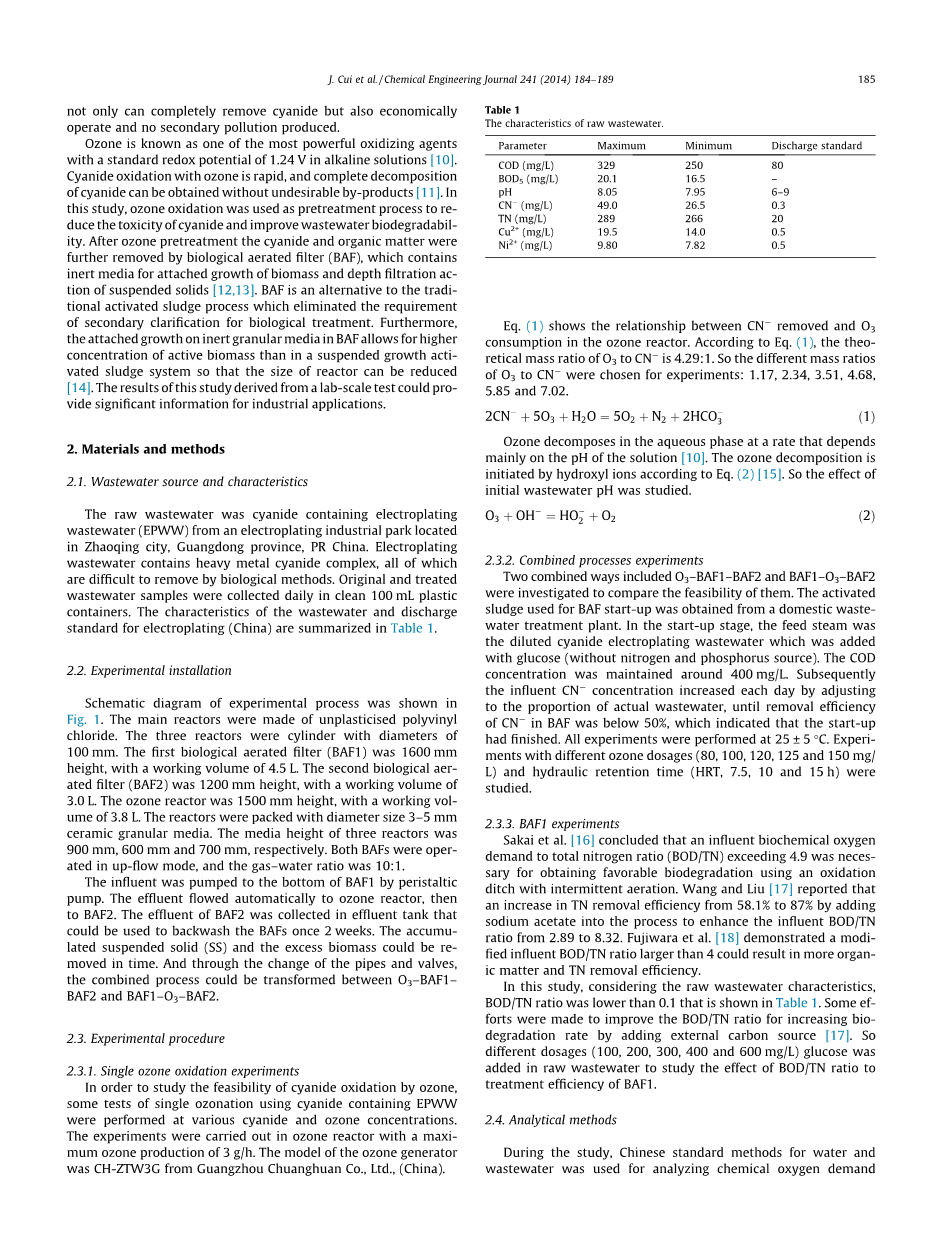 臭氧氧化与曝气生物滤池联合工艺处理含氰电镀废水外文翻译资料
