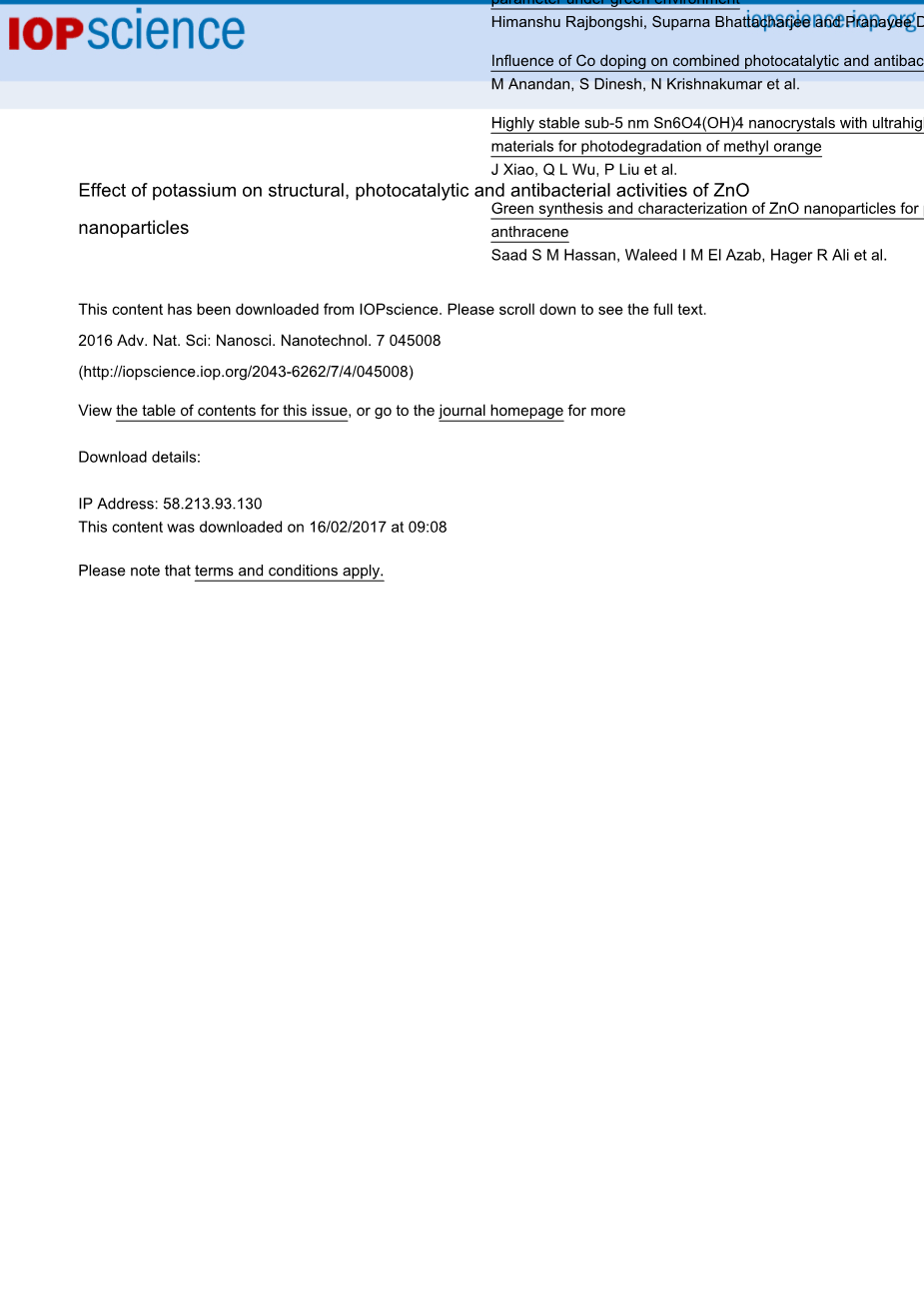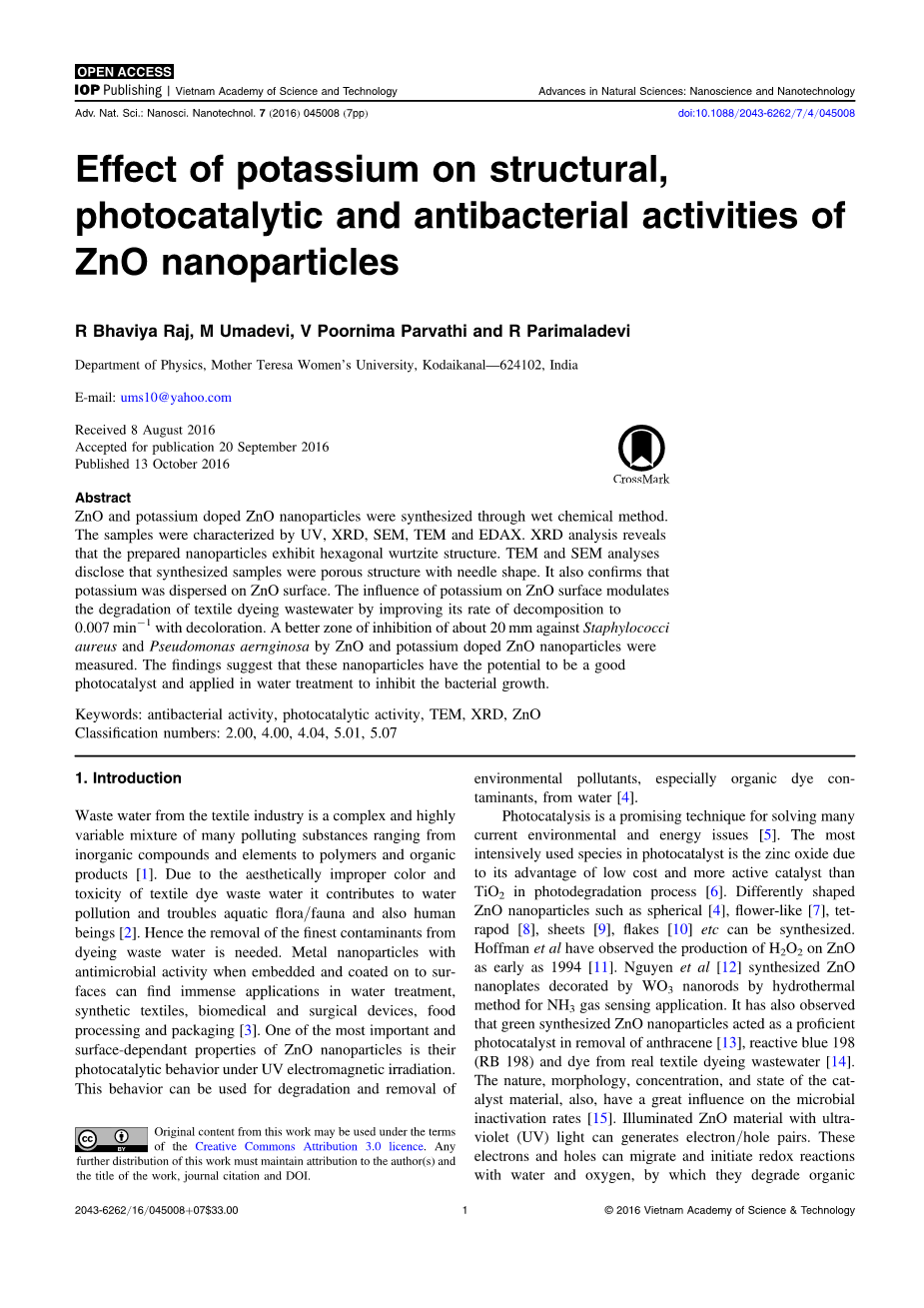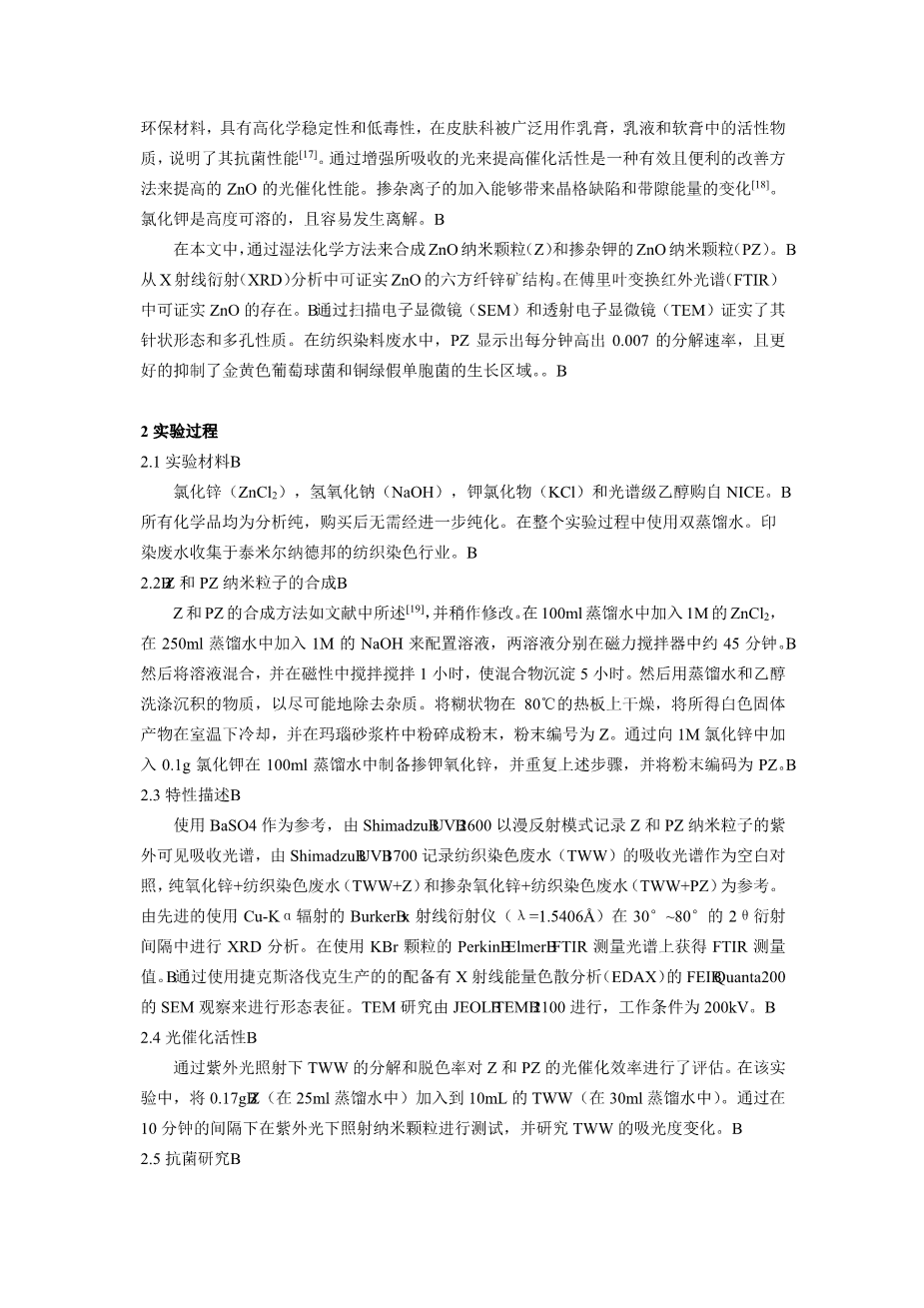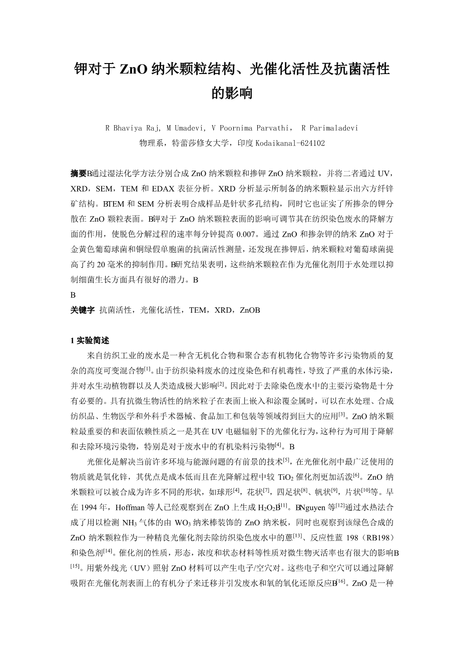钾对于ZnO纳米颗粒结构、光催化活性及抗菌活性的影响外文翻译资料