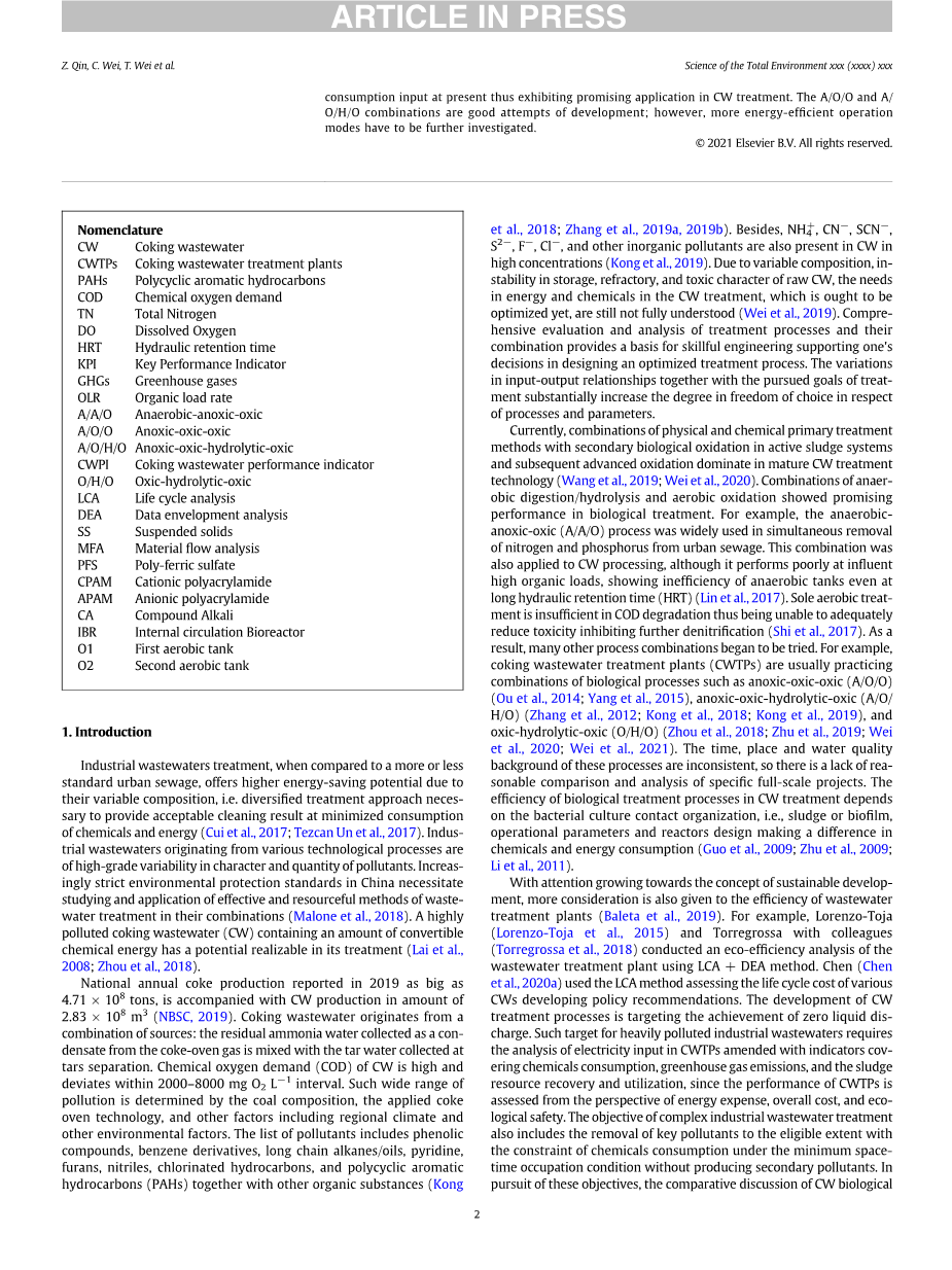 目前,在成熟的连续波处理技术中,物理化学一级处理方法与活性污泥系统中的二级生物氧化和后续高级氧化相结合的方法占主导地位(Wang et al., 2019; Wei et al., 2020)。厌氧消化/水解 好氧氧化组合在生物处理中表现出良好的应用前景。例如厌氧-缺氧-好氧(A/A/O)工艺被广泛应用于城市污水中氮、磷的同时去除。这种组合也应用于CW处理,尽管它在进水的高有机负荷下表现不佳,表明即使在长水力滞留时间(HRT)下,厌氧罐的效率也很低。(Lin et al., 2017)。单一好氧处理对COD的降解作用不足,不能充分降低毒性,抑制进一步脱氮(Shi et al., 2017)。结果,许多其他工艺组合开始被尝试。例如,焦化废水处理厂(CWTPs)通常采用缺氧-好氧-好氧(A/O/O)等生物处理方法的组合(Ou et al., 2014; Yang et al., 2015),缺氧-好氧-水解-好氧(A/O/H/O)(Zhang et al., 2012; Kong et al., 2018; Kong et al., 2019),和好氧-水解-好氧(O/H/O)(Zhou et al., 2018; Zhu et al., 2019; Wei et al., 2020; Wei et al., 2021). 这些过程的时间、地点和水质背景不一致,缺乏对具体的全规模工程进行合理的比较和分析。在连续水处理中,生物处理过程的效率取决于细菌培养接触组织,即污泥或生物膜,操作参数和反应器设计在化学品和能源消耗方面的差异 (Guo et al., 2009; Zhu et al., 2009; Li et al., 2011)。