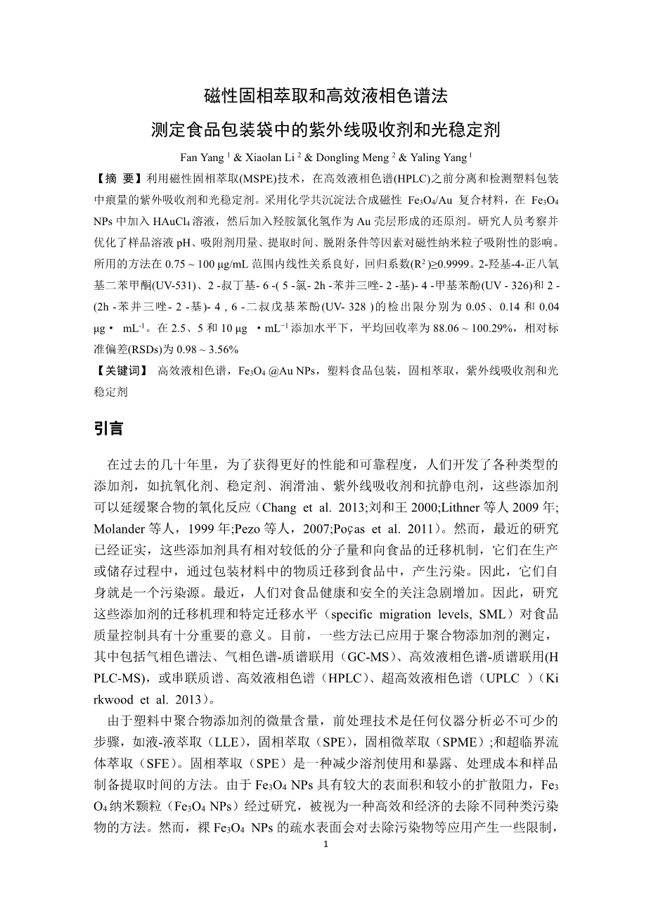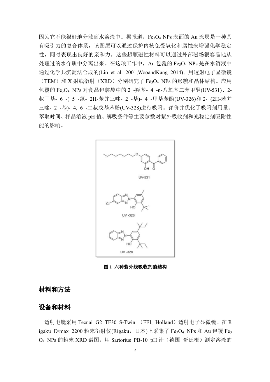 磁性固相萃取和高效液相色谱法测定食品包装袋中的紫外线吸收剂和光稳定剂外文翻译资料 2023-04-19 18:20:41 英语原文共 8 页,剩余内容已隐藏,支付完成后下载完整资料 英语译文共 11 页,剩余内容已隐藏,支付完成后下载完整资料 资料编号:[588627],资料为PDF文档或Word文档,PDF文档可免费转换为Word 您需要先支付 30元 才能查看全部内容!立即支付 发小红书推广免费获取该资料资格。点击链接进入获取推广文案即可: Ai一键组稿 | 降AI率 | 降重复率 | 论文一键排版 PREVIOUS NEXT 您可能感兴趣的文章 300 m3/d香料废水处理工程设计开题报告 某啤酒生产企业1200吨/天啤酒废水处理站设计开题报告 竹炭对水中铅和镉双组份的吸附性能研究开题报告 典型昆虫生长调节剂对的Daphnia magna毒性效应影响研究开题报告 2014年至2017年贵州省贵阳市空气质量统计分析开题报告 钙基生物炭复合材料的水分和养分保持性能研究文献综述 关于壳聚糖小球吸附VOC气体的研究开题报告 镇江市垃圾填埋场扩建工艺设计开题报告 荆州新堤主城区排水工程初步设计开题报告 芘污染土壤机械化学修复研究文献综述
