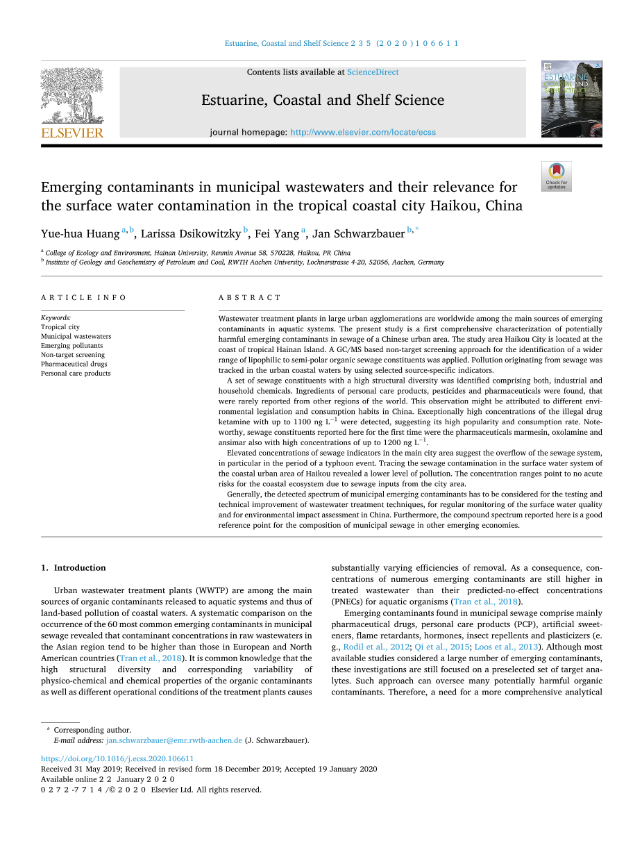 中国热带沿海城市海口城市污水中的新兴污染物及其与地表水污染的关系