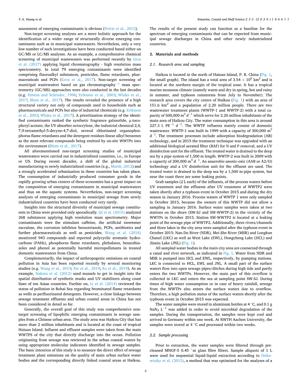 通常,这项研究的总体目标是对来自中国城市污水样品中的亲脂性新兴污染物进行全面的非目标筛查。研究区域是海口市,人口超过200万,位于热带海南岛的海岸。进水和污水样品取自该市主要的污水处理厂,直接排放到海洋中。通过使用污水样品中确定的适当分子指标,在城市沿海水域中回收了源自污水的污染。这项研究的基本目的是测量污水处理厂排放物对主要城市地表水体以及相应的海口沿海地