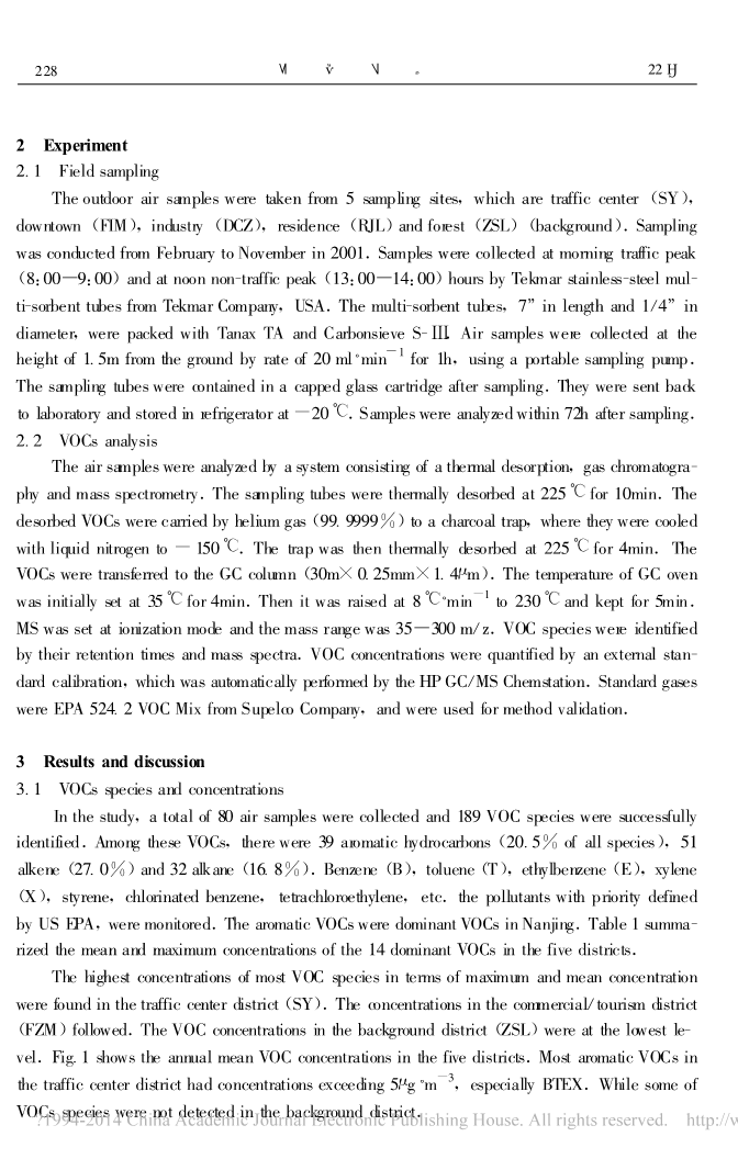 野外空气采样是从五个不同的采样地点采集,分别是交通中心(SY),市中心(FIM),工业区(DCZ),居住区(RJL)和森林地区(ZSL)(背景值)。样品采集时间从2001年二月份到九月份。用由美国泰克玛公司制造的泰克玛不锈钢多吸收剂吸收管样品的采集时间在早高峰(8:00—9:00)和晚高峰(13:00—14:00)时间。长度是7毫米,直径是0.25毫米的多吸收剂吸收管被Tanax TA和Carbonsieve S-III充满。空气采样是用一种便携式采样器从距离地面1.5m的空中以20ml/min的速率采集一个小时。采样后采样管被包含在一个加盖的玻璃盒中。他们被送回实验室并被在零下20度恒温冰箱中保存。样品被采集之后在72小时之内分析。