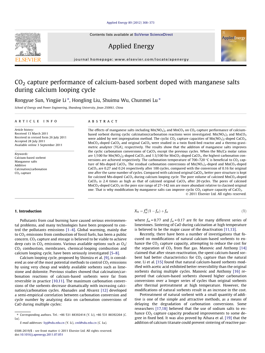CO2 capture performance of calcium-based sorbent doped with manganese salts during calcium looping cycle